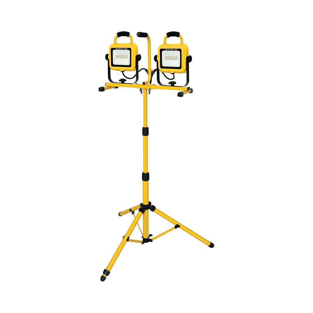 Delivering 20,000 lumens, this LED tripod work light features a 50,000-hour lifespan, extendable tripod, 2-in-1 quick-release removable H-base, and rugged die-cast aluminum housing. It includes a USB charging port, storage bag, 2,500-volt surge protection, 5000K rating, and cULus approval.