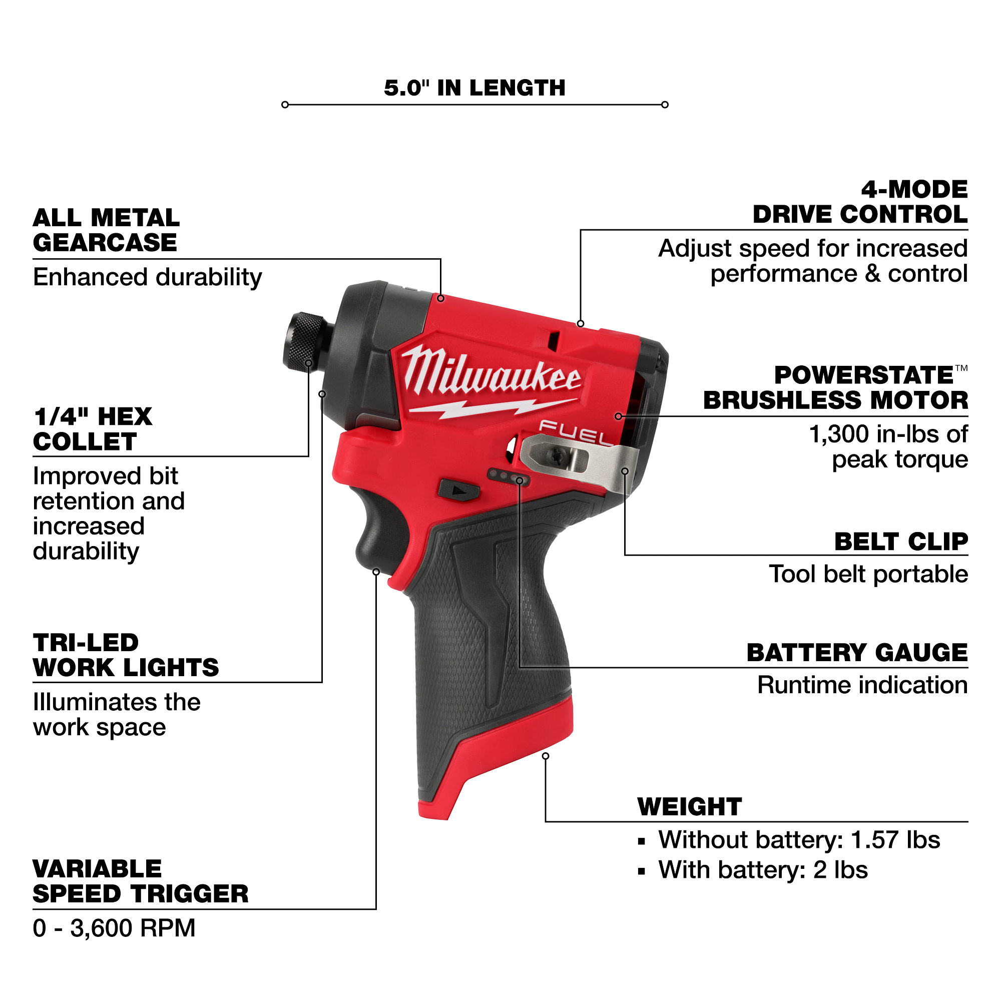 The MILWAUKEE® M12 FUELâ„¢ 1/4″ Hex Impact Driver is the Fastest Subcompact Impact Driver, the Most Compact, and provides Maximum Workspace Visibility. The POWERSTATEâ„¢ Brushless motor delivers the fastest driving speeds in the subcompact class for unmatched productivity. At only 5″ long and 7.6″ tall (with M12 CP 2.0 Ah battery), this solution is the most overall compact impact driver in class, allowing greater access in tight spaces and overall portability. Tri-LEDs surround the bit accessory with brighter lights and less shadows providing maximum workspace visibility. MILWAUKEE® REDLINK PLUSâ„¢ Intelligence delivers top of the line thermal performance allowing more work to be completed. Get all day runtime when paired with the MILWAUKEE® M12 REDLITHIUMâ„¢ battery pack. The M12 FUELâ„¢ Impact Driver is part of MILWAUKEE® M12â„¢ System which is fully compatible with over 125 solutions.