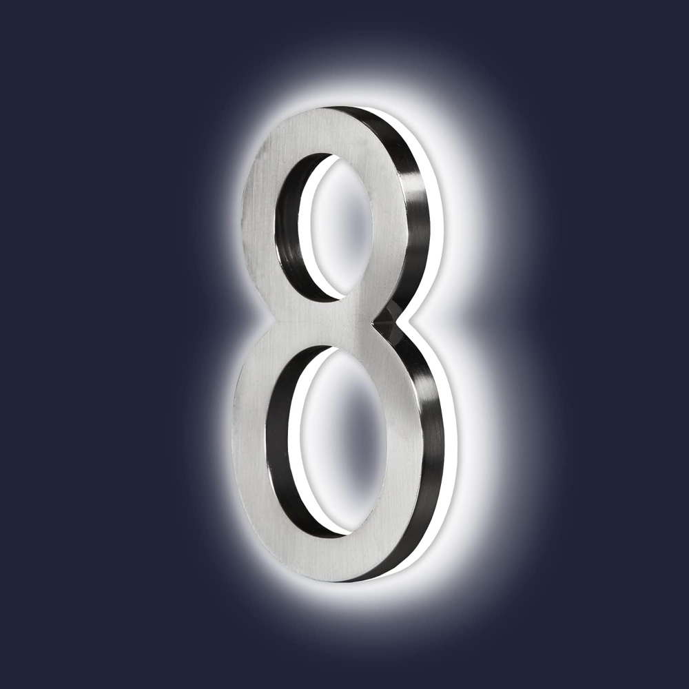 The LED backlit house number by PRO-DF will make your address visible, day and night. It features an elegant satin nickel finish and the latest LED technology. The backlit design improves considerably the visibility at night (visible over 10 ft.) with a nice contemporary glow behind the number. The light is projected onto the address plaque or onto the wall surface, depending on the installation. On the back, it has built-in spacers raising the number 1/2 in. from the surface, for a unique floating effect. Made from high quality zinc along with frosted ABS plastic. The LED house number is completely weatherproof and rustproof, it will resist to our harsh weather conditions. Proudly designed in Canada. Low Voltage – 12 to 18-Volt. Address plaques and optional wires are sold separately. Instruction, drilling template and mounting hardware are included.