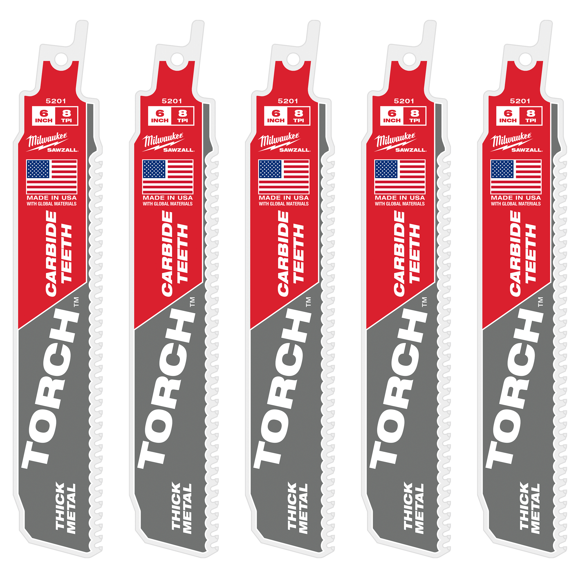 The MILWAUKEE® TORCH™ with Carbide Teeth for Thick Metal SAWZALL® Blade cuts longer, cuts more, and cuts faster. This carbide SAWZALL® blade is designed with Carbide Teeth for longer life vs. bi-metal blades in black iron, rebar, stainless steel, cast iron, and more. The 8 TPI design is ideal for fast, smooth cuts in thick metals​.