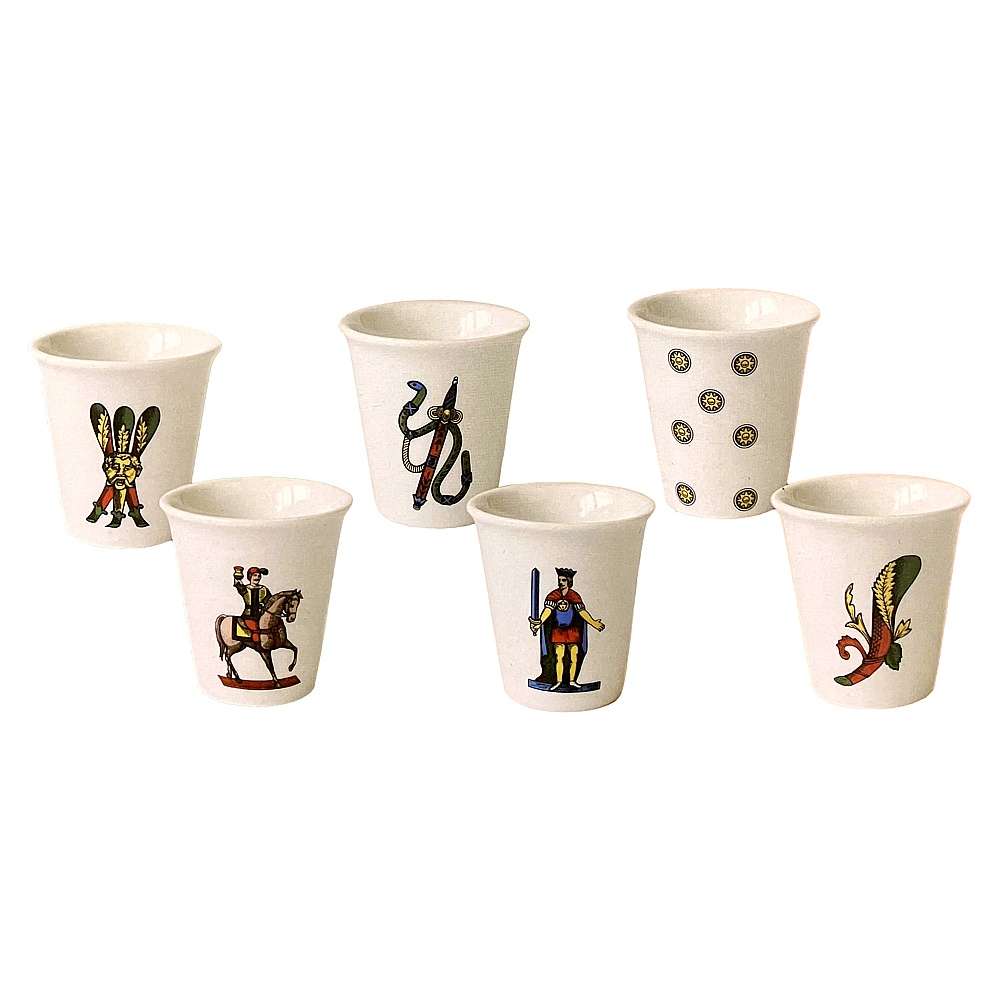 The Adamo Italian Playing Cards Macchiato Cup Set includes six 90 ml porcelain cups inspired by traditional Napoletane Italian playing cards. Each cup features a different card figure, echoing the suits of swords, cups, coins, and clubs that appear in classic games like Scopa and Briscola.