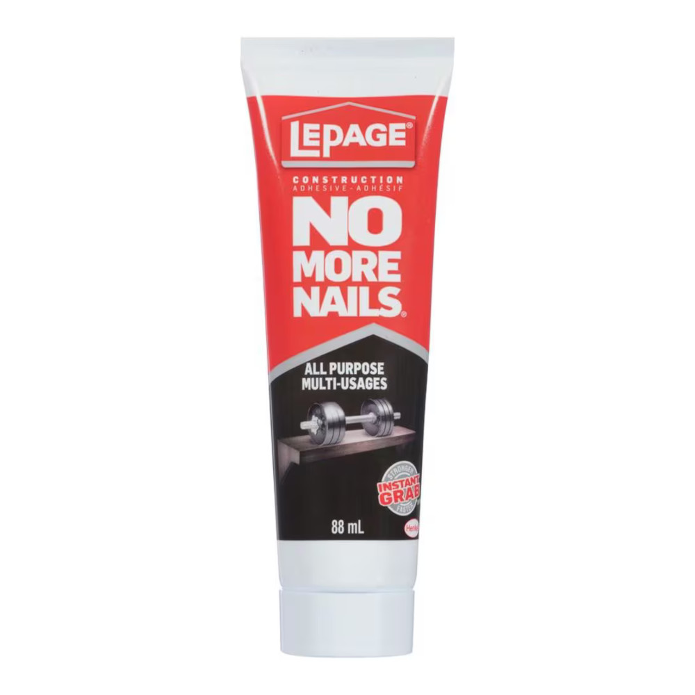 LePage No More Nails All Purpose Construction Adhesive is a premium quality, high strength, gap-filling adhesive with 0 second instant grab. This extremely high tack adhesive reduces the need for bracing with nails and screws in many DIY projects and repair jobs!