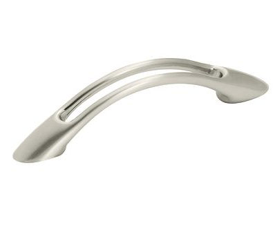 Product Features: Contemporary arch style cabinet pull Finished in Satin Nickel Overall Length: 4.5 Projection: 1 Mounting Hole Centers: 3.