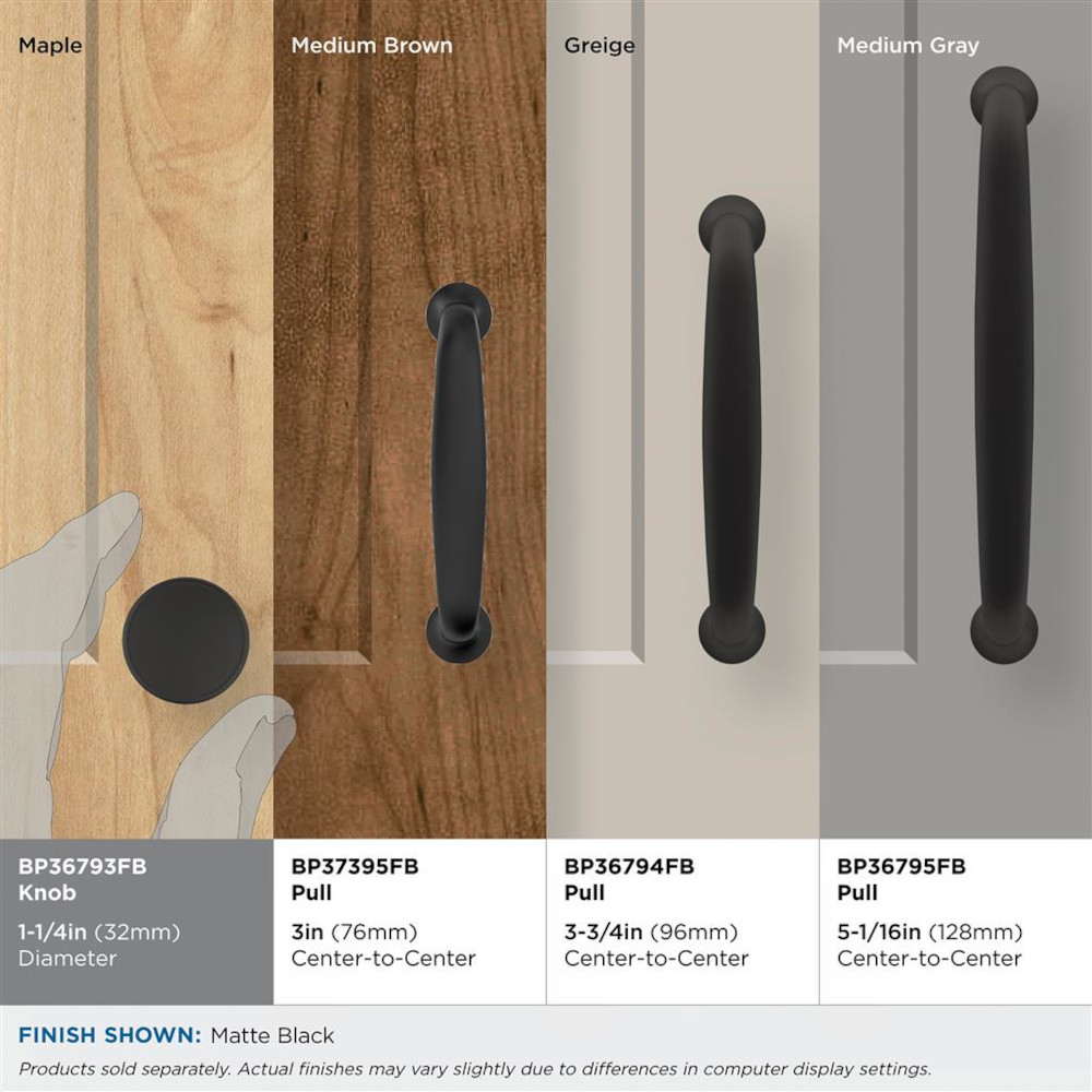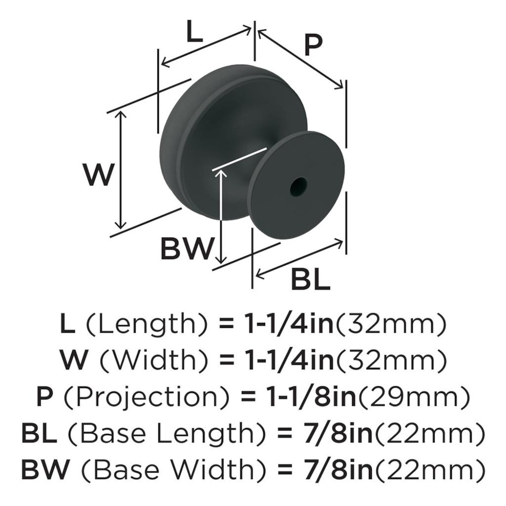 A nod to new traditional style, the Renown collection imparts refined simplicity and approachable character that enhances the décor. The Amerock BP36793FB Renown 1-1/4 inch (32mm) Diameter Knob is finished in Matte Black.