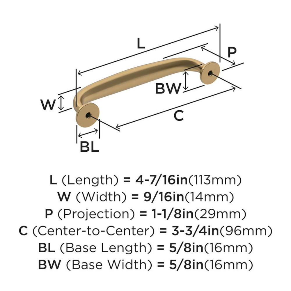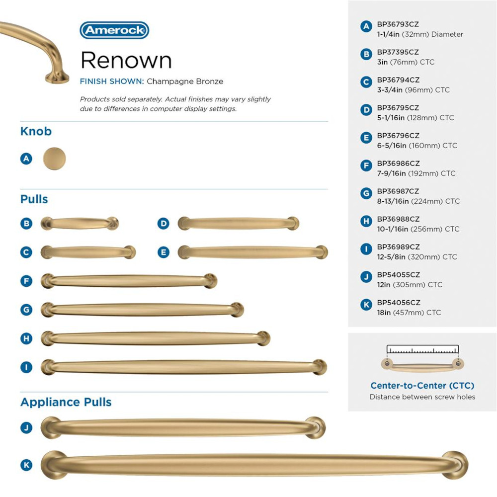 A nod to new traditional style, the Renown collection imparts refined simplicity and approachable character that enhances the décor. The Amerock BP36794CZ Renown 3-3/4 inch (96mm) Center-to-Center Pull is finished in Champagne Bronze.