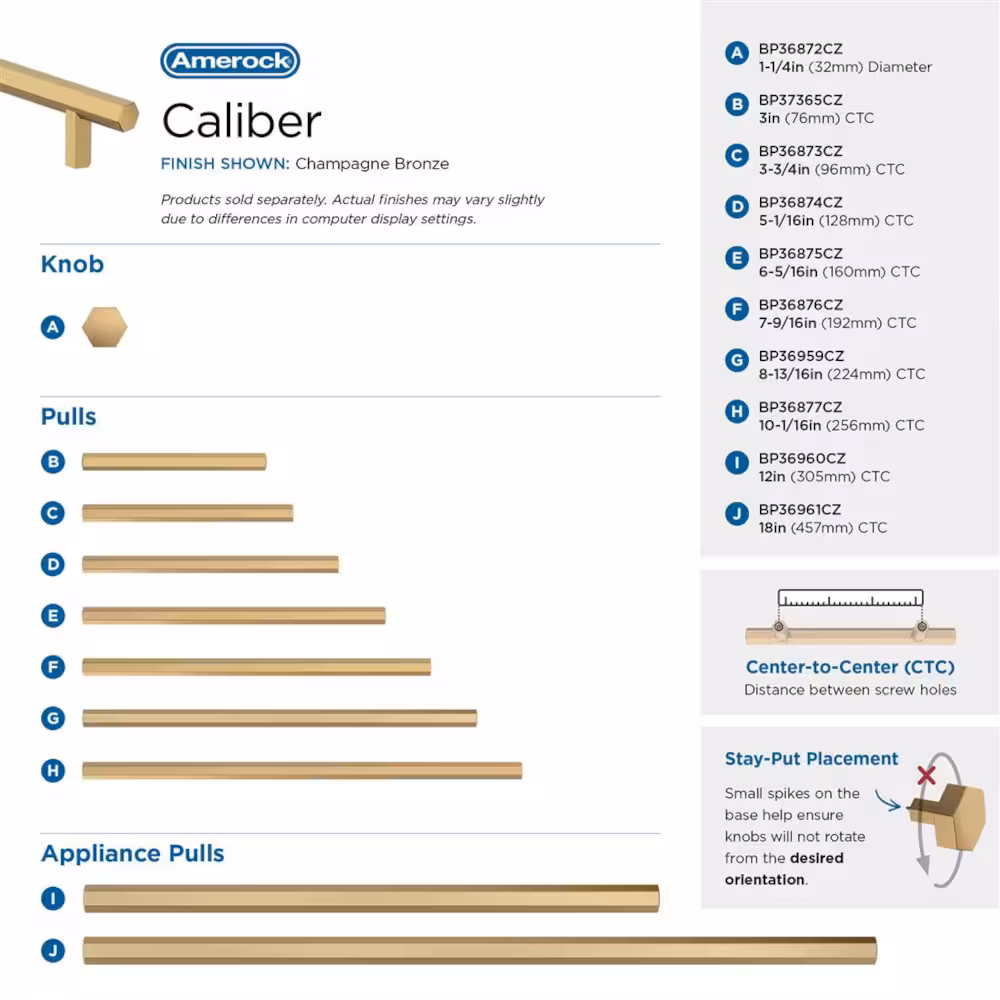 The Caliber collection brings a modern edge to cabinetry with a geometric bar pull design that adds a subtle twist to a classic shape. With its contemporary, chic styling, it delivers a clean, statement-making look that leaves a lasting impression in kitchens, bathrooms, and built-ins. The Amerock BP36959CZ Caliber 8-13/16 inch (224mm) Center-to-Center Pull is finished in Champagne Bronze.