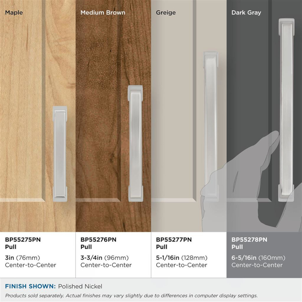 Inspired by hard, geometric lines, the Blackrock collection’s simple shapes make a lasting impression. The Amerock BP55278PN Blackrock 6-5/16 inch (160mm) Center-to-Center Pull is finished in Polished Nickel.
