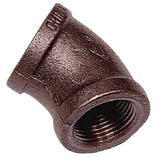 This 45° elbow is made of black malleable iron with internal thread ends. The maximum working pressure is 150 PSI. | Aqua-dynamic Black Iron Elbow – 1″ 5520-205 Aqua-Dynamic | Black Iron Elbow – 1″ .