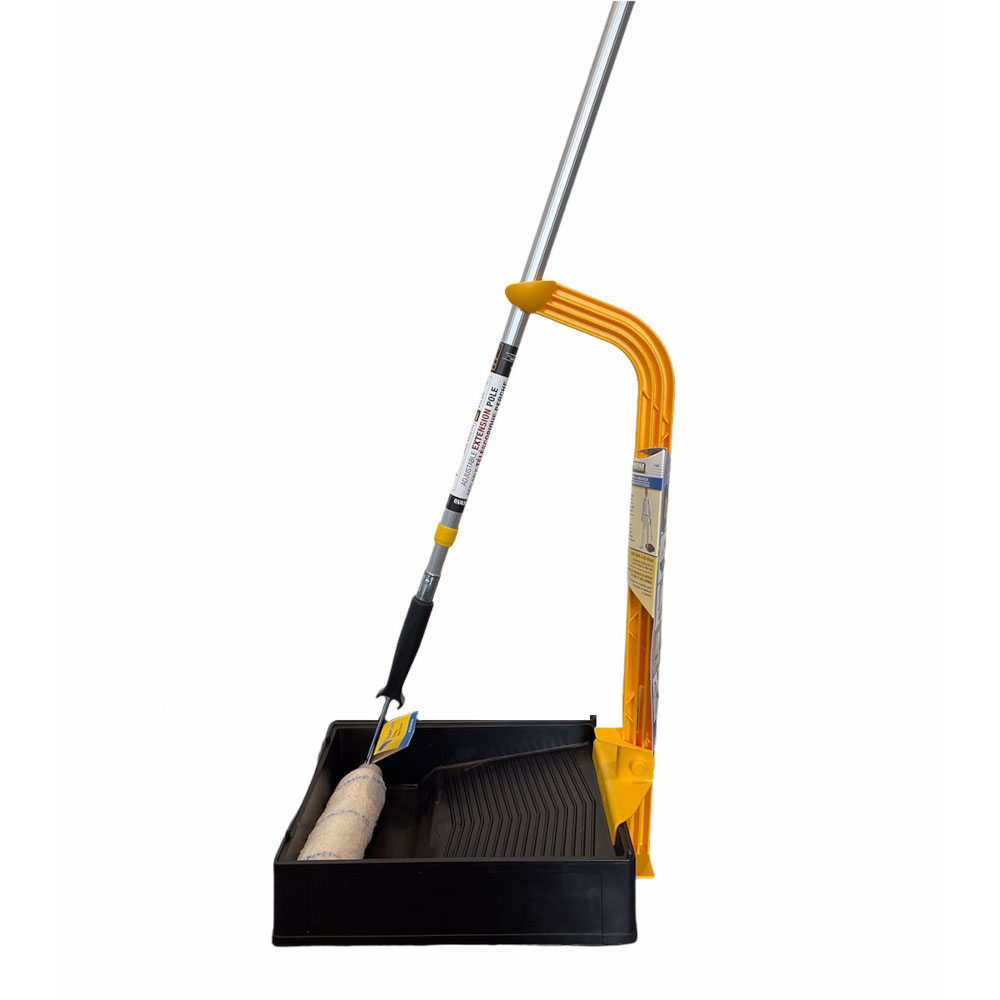 This tool is designed to help make your painting jobs easier. It has a clamp at the base that attaches to the Simms plastic and metal trays. This creates a sturdy resting spot when using a roller with an extension pole keeping both in an upright position. You can also use the arm to easily pick up and move your paint tray and roller without having to bend down! Ideal for use with Simms Plastic Tray.