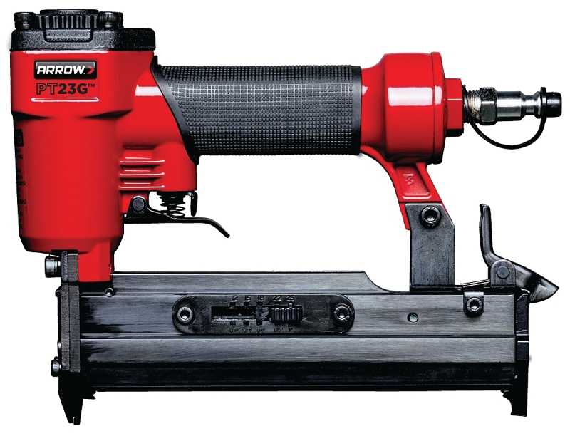 Arrow’s PT23G pneumatic pin nailer is great for trim jobs, crafts and hobby work that require headless pin nails. The tool features a lightweight compact design, adjustable exhaust cover, contact safety and overmolded grip. PT23G comes with all necessary fittings and operates on home compressor units up to 120 psi. The easy-to-load magazine makes loading nails and clearing any jams easy, reducing project frustration and down time.