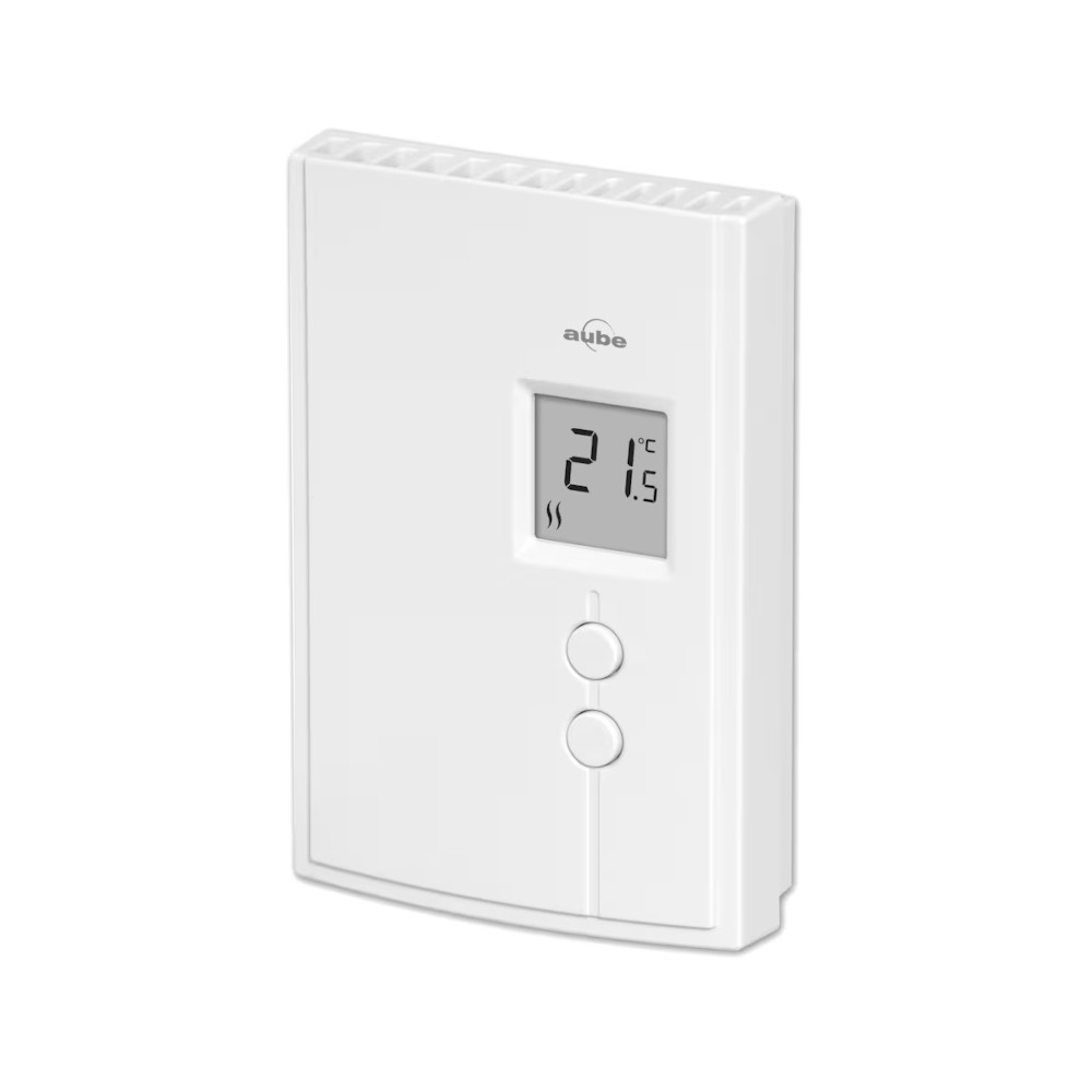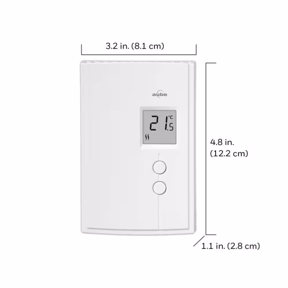 This Aube compact thermostat delivers exceptional accuracy and silent operation, and is ideal for small spaces. It features ultimate temperature control – the most accurate type of thermostat on the market (+/-0.15C). On-screen heating power indicator gives at-a-glance verification of power being used, and 2-wire non-polarized connection means fast, hassle-free installation. A slim, compact design makes installation ideal for small spaces. Minimum load means this thermostat can control smaller baseboards (i.e. 2 ft. baseboard), and is also ideal for radiant ceilings.