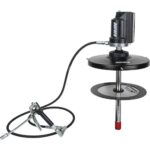 Ideal for applications having continuous need for high pressure grease, Recommended air pressure between 60 and 125 PSI, Comes with 12″ diameter drum cover, rubber-lined follower plate, 7′ of high pressure grease hose, Z swivel and grease control valve, For 25-50-lb. pails