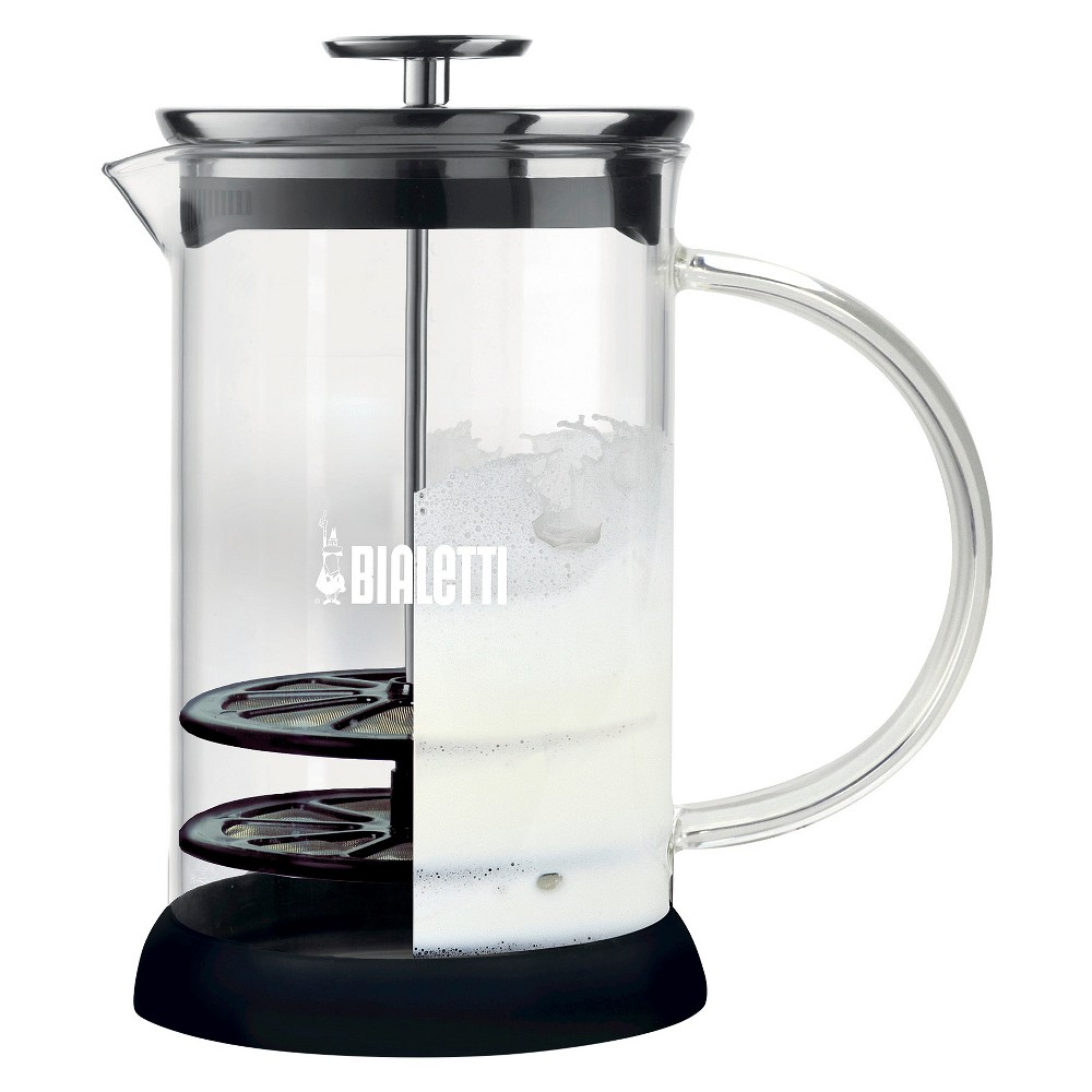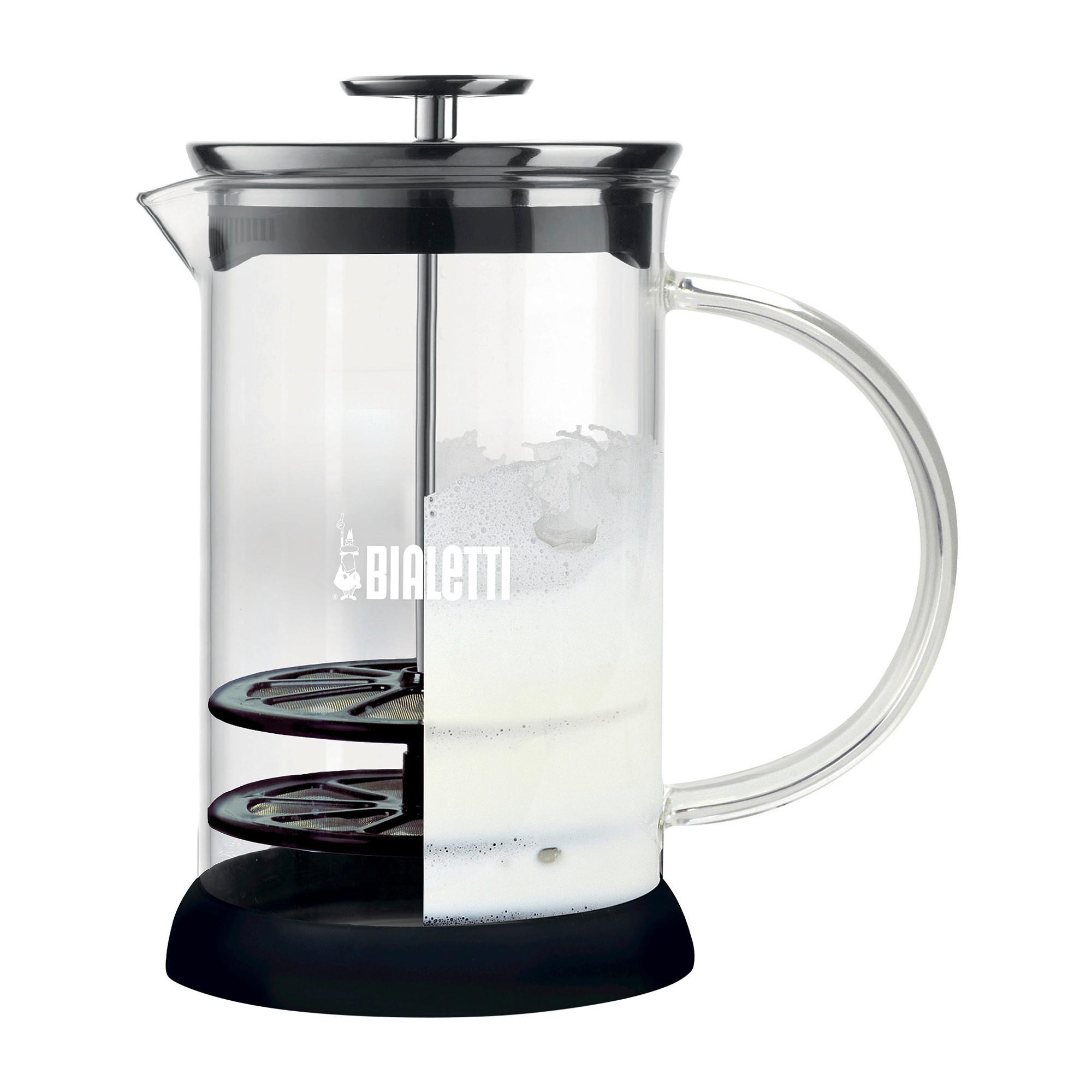 The Bialetti manual milk frother produces thick rich frothed milk in seconds. A simple and easy way to create lattes cappuccinos or hot chocolate in the comfort of your own home. The double action frother makes extra-thick foam and the vessel includes a non-slip base. Glass vessel allows it to be placed in the microwave to heat milk. Combine a Bialetti Moka Express with this product and be your own barista.