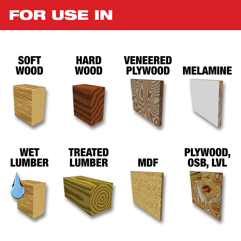 – Great for use with: Softwoods, Hardwoods, Malamine, MDF, Veneered Plywoods, Wet Lumber, Treated Lumber and Laminated Woods such as Plywood, OSB, LVL, PSL, LSL & OSL