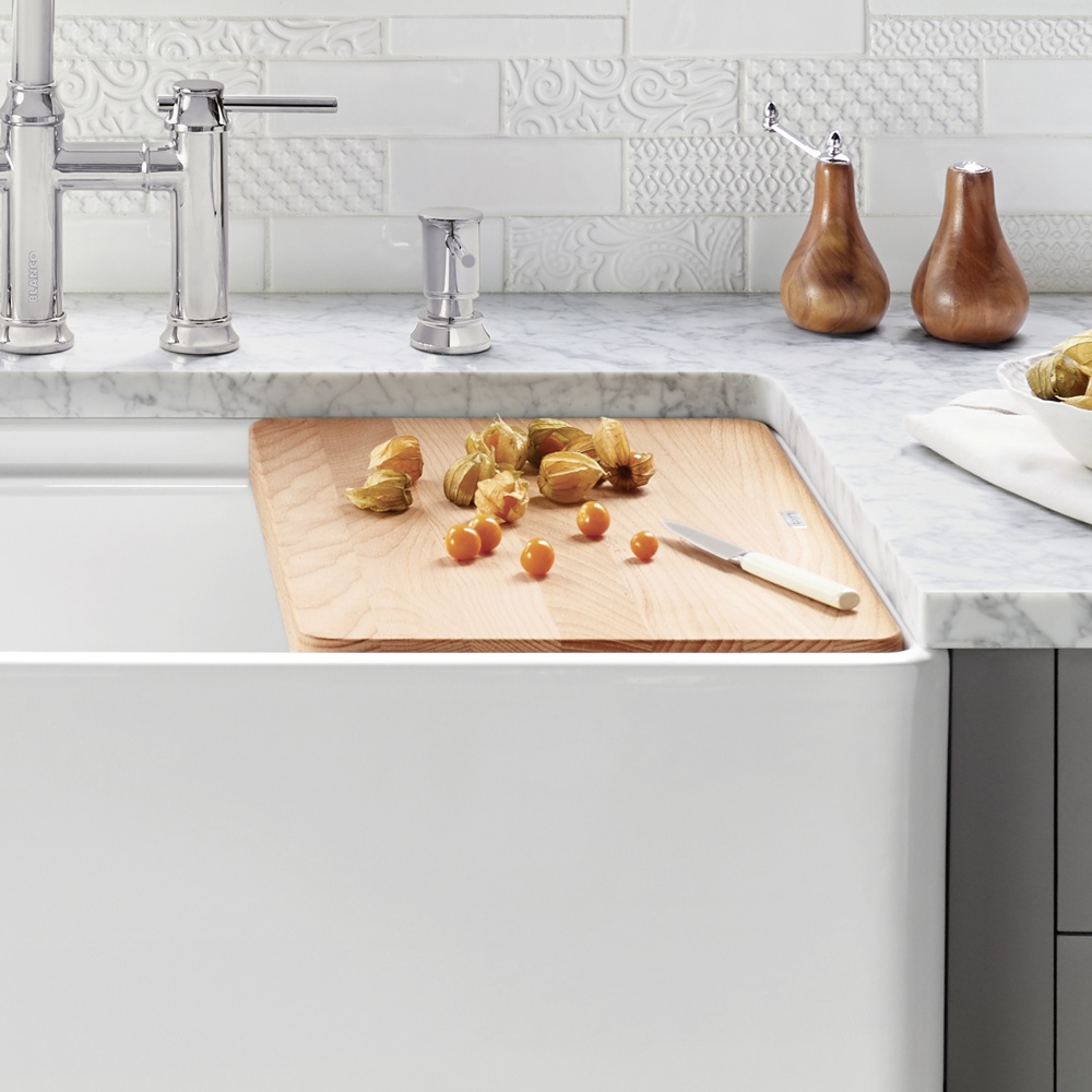 Accentuate your sink with the look of warm wood while you slice and dice with ease. BLANCO’s premium wood cutting boards are the ultimate sink accessory and offer more than just beauty. Made with high-quality beechwood, this cutting board will allow you to tackle food preparation with ease. Our ultra-durable cutting boards are designed to fit right on your sink and can stand up to whatever you’re cutting, chopping, dicing and slicing. When used within the sink, it creates an entirely new working space for food prep. You can now chop and dice all of your favorite foods right on top of your sink and easily wipe the excess into the bowl below. This cutting board even comes with rubber feet for countertop use. Our cutting boards are highly functional and will add a touch of beauty to any kitchen space.