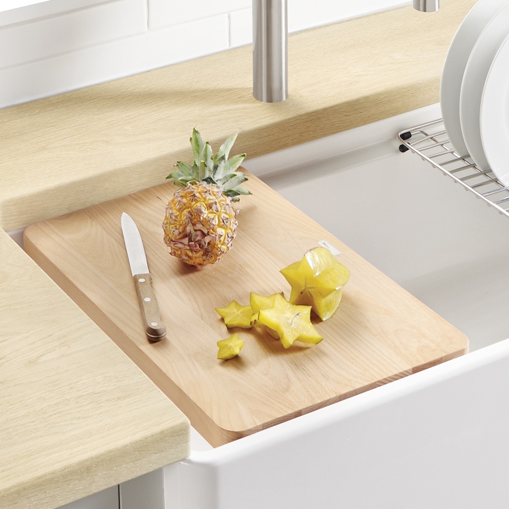 - Cutting board perfectly sits inside the sink’s ledge, so you can comfortably wash, dry, peel, and chop at countertop height