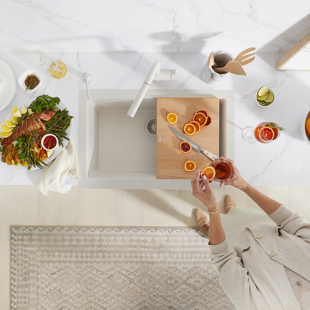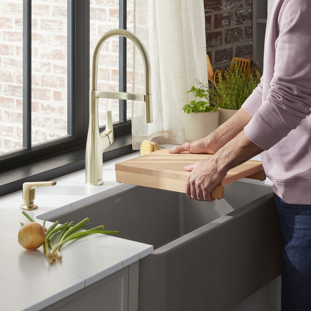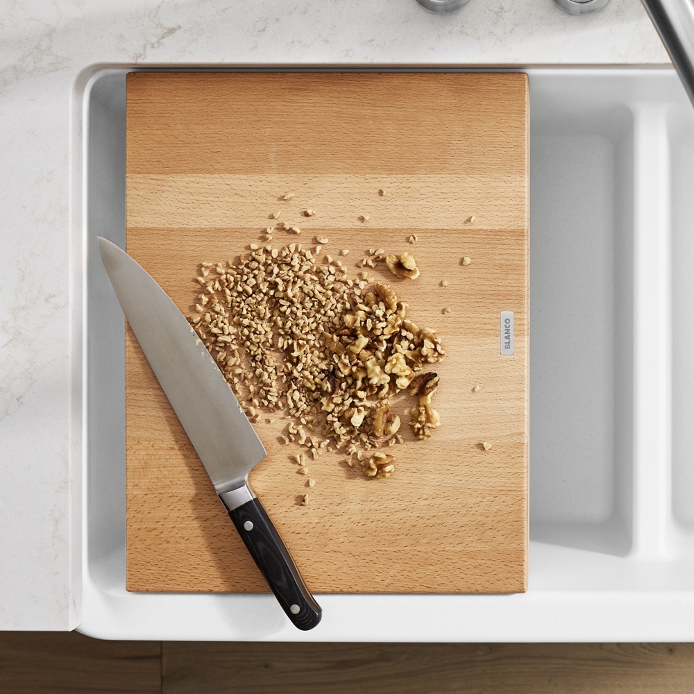 Create the ultimate workstation and accentuate your sink with the look of warm wood. The Beechwood Floating Cutting board is custom-designed to fit all BLANCO VINTERA and IKON Farmhouse Sinks. BLANCO’s premium wood cutting boards are the ultimate sink accessory made with high-quality beechwood. This cutting board will allow you to tackle food preparation with ease by fitting right inside your sink and will transform your sink into a multi-functional workstation. Chop and dice over your sink at countertop height and easily wipe the excess directly into the sink.