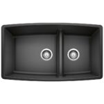 The BLANCO PERFORMA U 1 3/4 DOUBLE BOWL UNDERMOUNT KITCHEN SINK with LOW DIVIDE features a 60/40 bowl design, offering plenty of room for rinsing, washing and soaking. The 60/40 bowl split allows for washing larger items while still leaving the smaller bowl open. Made of SILGRANIT®, PERFORMA kitchen sinks are engineered to withstand heavy cookware and hot bakeware. Silgranit sinks are not only strong but also beautiful, available in a range of nature-inspired colours that effortlessly complement the latest kitchen trends. Combine the PERFORMA double bowl sink with a BLANCO faucet and accessories to create a BLANCO UNIT; a seamlessly integrated kitchen solution designed to transform kitchen chores into joyful experiences. Everything you need to drink, prep and clean, all in one place.
