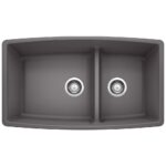 The BLANCO PERFORMA U 1 3/4 DOUBLE BOWL UNDERMOUNT KITCHEN SINK with LOW DIVIDE features a 60/40 bowl design, offering plenty of room for rinsing, washing and soaking. The 60/40 bowl split allows for washing larger items while still leaving the smaller bowl open. Made of SILGRANIT®, PERFORMA kitchen sinks are engineered to withstand heavy cookware and hot bakeware. Silgranit sinks are not only strong but also beautiful, available in a range of nature-inspired colours that effortlessly complement the latest kitchen trends. Combine the PERFORMA double bowl sink with a BLANCO faucet and accessories to create a BLANCO UNIT; a seamlessly integrated kitchen solution designed to transform kitchen chores into joyful experiences. Everything you need to drink, prep and clean, all in one place.