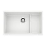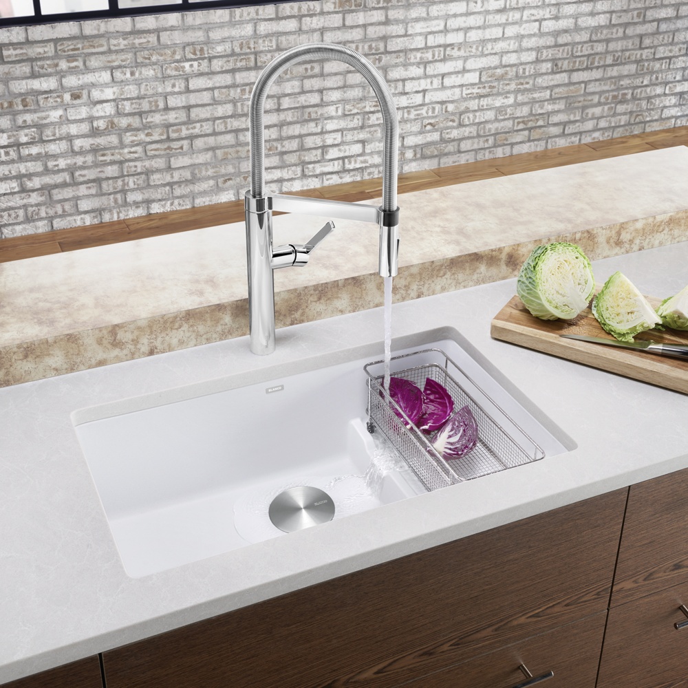 The PRECIS CASCADE UNDERMOUNT KITCHEN SINK offers clean lines and a spacious single bowl design with an integrated second level for drying, depositing and draining. The two sections also allow you to separate clean and dirty dishes. Made of SILGRANIT®, PRECIS kitchen sinks are engineered to withstand heavy cookware and hot bakeware. Silgranit sinks are not only strong but also beautiful, available in a range of nature-inspired colours that effortlessly complement the latest kitchen trends. Combine the PRECIS sink with a BLANCO faucet and accessories to create a BLANCO UNIT; a seamlessly integrated kitchen solution designed to transform kitchen chores into joyful experiences. Everything you need to drink, prep and clean, all in one place.