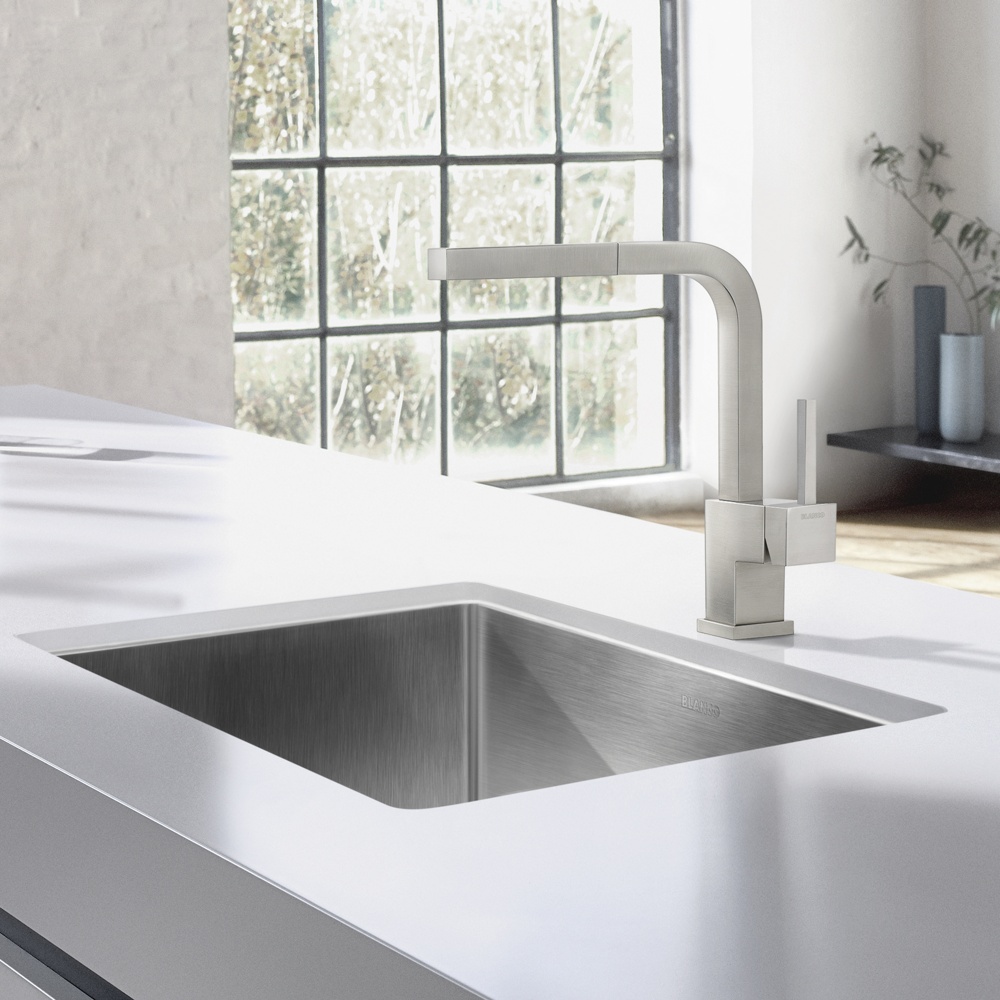 Everyday convenience meets modern design. The QUATRUS R15 25″ Single Bowl Undermount Stainless Steel Kitchen Sink is ideal for busy kitchens thanks to its spacious single bowl configuration that allows for easy washing of large pots and pans. German-engineered with corrosion-resistant stainless steel for long-lasting durability and 15 mm radius corners for low-maintenance cleaning —the QUATRUS R15 25″ sink makes kitchen life easy. Combine the QUATRUS R15 25″ sink with a BLANCO faucet and accessories to create a BLANCO UNIT; a seamless, fully integrated, kitchen solution designed to transform kitchen chores into joyful experiences. Everything you need to drink, prep and clean, all in one place.