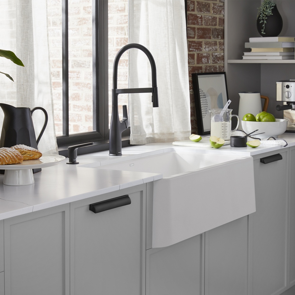 The IKON farmhouse sink is a fresh take on the classic farmhouse style. The kitchen sink’s slightly angled apron-front design adds architectural detail and comes in a range of nature-inspired colours that complement the latest kitchen trends. BLANCO’s IKON 30” sink features a spacious single bowl for easy washing of large pots and pans. Made of BLANCO’s patented SILGRANIT® composite material, IKON sinks are engineered to withstand heavy cookware and hot bakeware. Combine the IKON 30” sink with a BLANCO faucet and accessories to create a BLANCO UNIT; a seamless, fully-integrated kitchen solution designed to transform kitchen chores into joyful experiences.