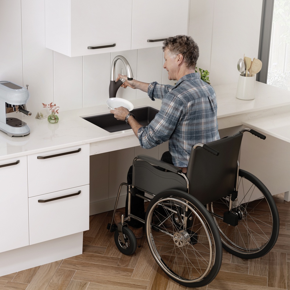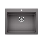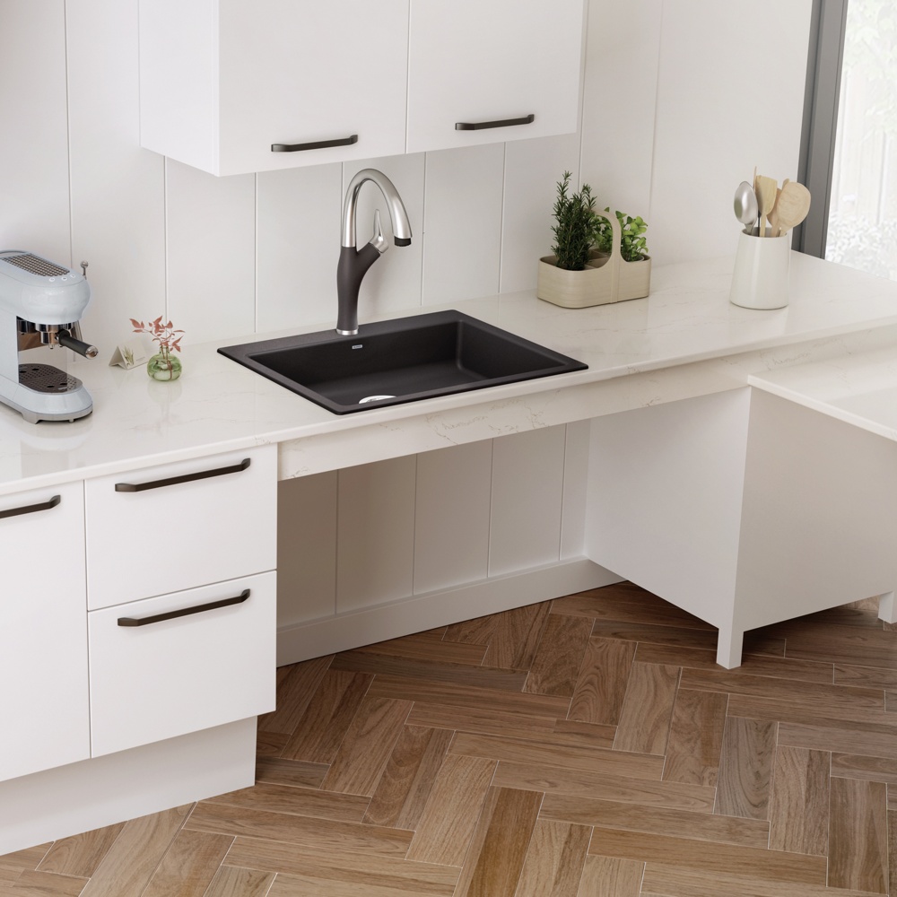 The PRECIS 25” SINGLE BOWL ADA/CSA KITCHEN SINK offers clean lines and a simple but spacious single bowl design. This ADA-compliant kitchen sink features a reduced bowl depth for wheelchair accessibility and a rear-positioned drain hole, which helps provide knee clearance when the sink is used from a seated position. This kitchen sink is made of SILGRANIT, a patented, certified granite composite material that is engineered to take on the toughest kitchen tasks. Beautiful and highly functional with its non-porous, hygienic surface, it pushes away liquids and residue resulting in a low maintenance, easy to clean, long-lasting material.