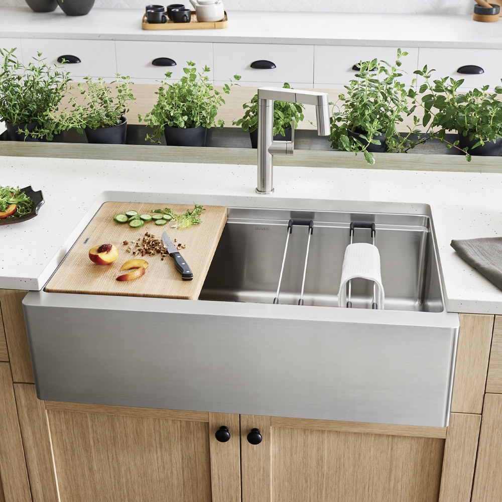 The QUATRUS R15 ERGON Farmhouse Sink is the perfect kitchen companion. Designed specifically to bring your work area closer with an innovative ledge and rail system, this farm sink makes food prep comfortable and enjoyable. The built-in ledge accommodates a variety of accessories, bringing several different kitchen tasks, including slicing and dicing to rinsing produce, within a comfortable reach. The QUATRUS R15 ERGON offers generous radius inside corners for easy cleaning and slightly rounded family-friendly outside apron corners. Combine the QUATRUS R15 ERGON with a BLANCO faucet and accessories to create a BLANCO UNIT; a seamless, fully-integrated kitchen solution designed to transform kitchen chores into joyful experiences. Everything you need to drink, prep and clean, all in one place.