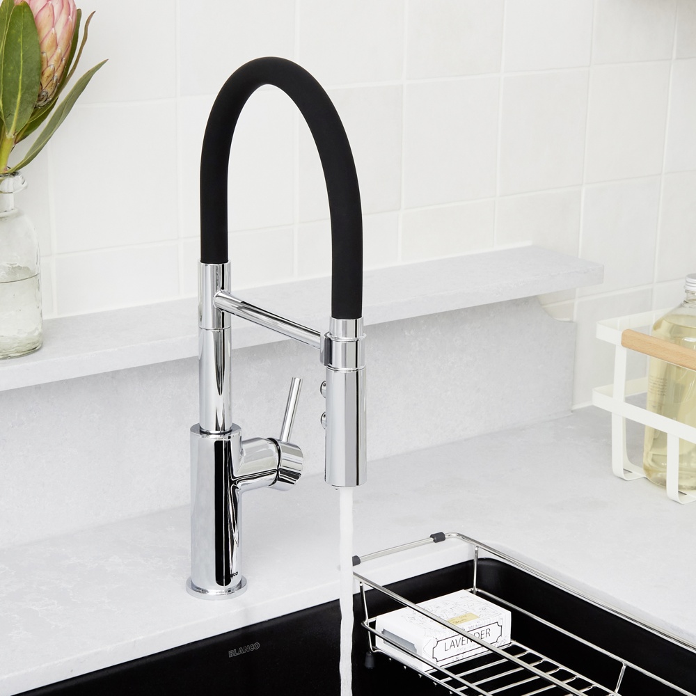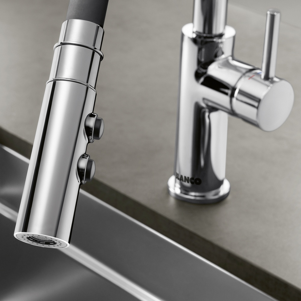 The CATRIS FLEXO offers a fresh take on the semi-professional faucet, combining functional elements and modern industrial flair. Designed to make cooking and cleaning more efficient than ever before, the CATRIS FLEXO boasts a 360-degree swivel for extended range of motion and dual spray functions to tackle everyday tasks from rinsing dishes to power washing dirty pots and pans. Its patented aerator significantly reduces limescale buildup, while its flexible, matte-black rubber hose provides a sleek, industrial look. The CATRIS FLEXO is built to deliver high performance for many years while providing long-lasting convenience. Easily pair your CATRIS FLEXO with your favorite BLANCO sink and accessories for a fully integrated BLANCO UNIT. With this setup, you’ll have everything you need to drink, prep and clean all in one place.