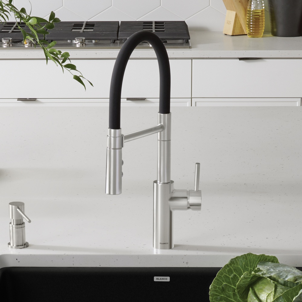 The CATRIS FLEXO offers a fresh take on the semi-professional faucet, combining functional elements and modern industrial flair. Designed to make cooking and cleaning more efficient than ever before, the CATRIS FLEXO boasts a 360-degree swivel for extended range of motion and dual spray functions to tackle everyday tasks from rinsing dishes to power washing dirty pots and pans. Its patented aerator significantly reduces limescale buildup, while its flexible, matte-black rubber hose provides a sleek, industrial look. The CATRIS FLEXO is built to deliver high performance for many years while providing long-lasting convenience. Easily pair your CATRIS FLEXO with your favorite BLANCO sink and accessories for a fully integrated BLANCO UNIT. With this setup, you’ll have everything you need to drink, prep and clean all in one place.
