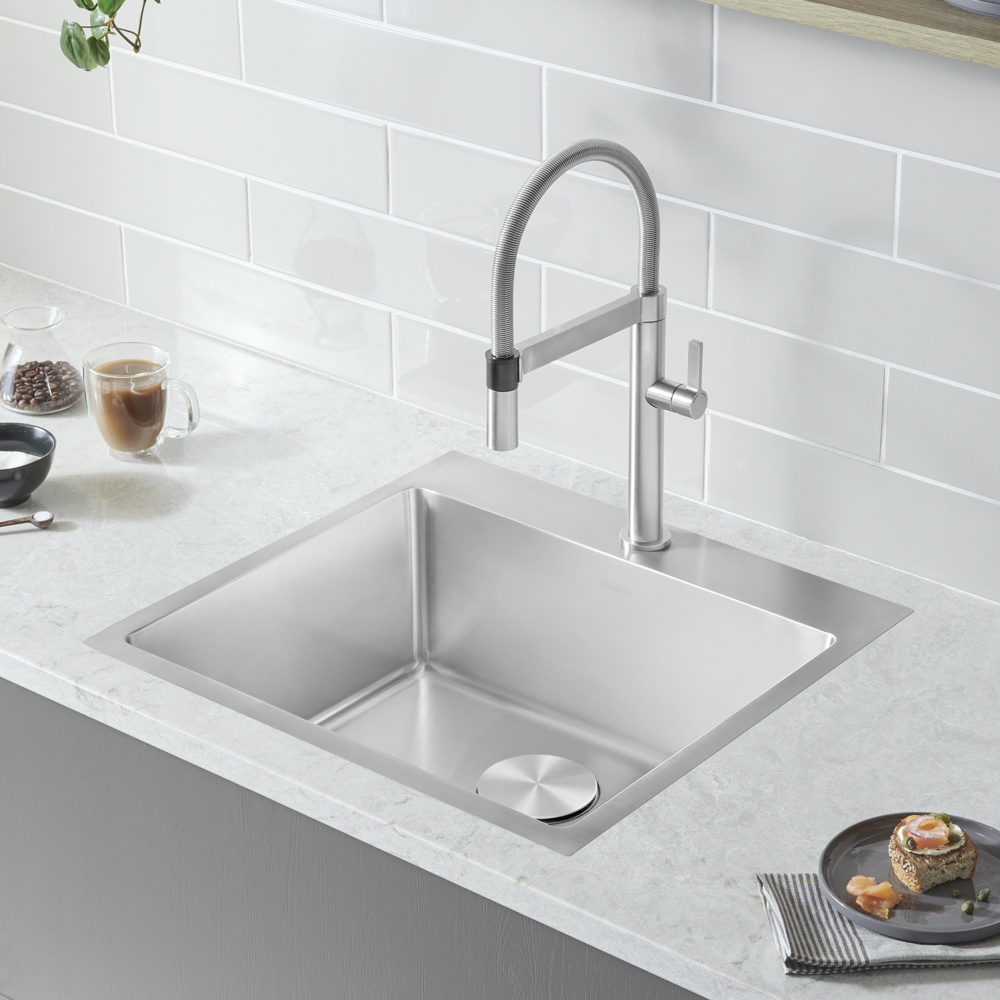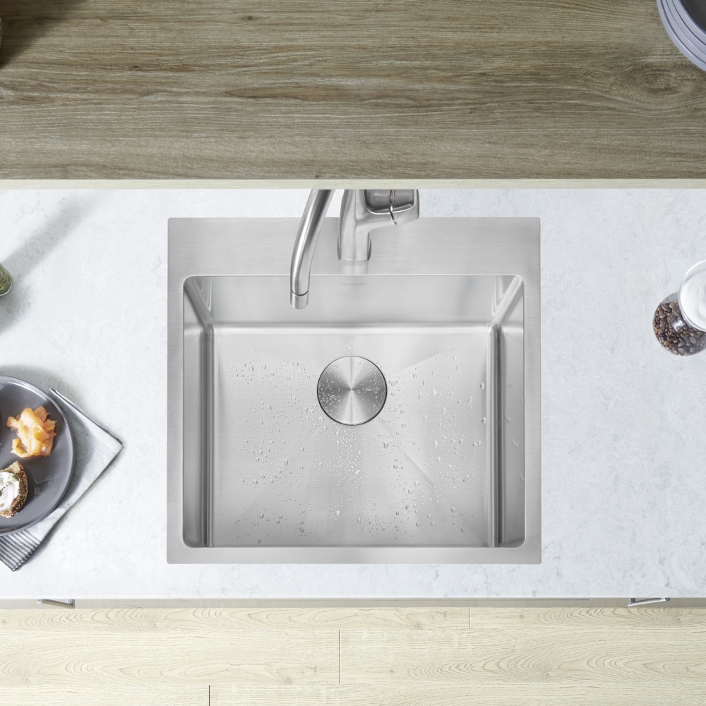 Everyday convenience meets modern design. The QUATRUS R15 22″ Single Bowl Dual Mount Stainless Steel Kitchen Sink is a must-have for anyone looking to maximize prep space; its compact size makes it ideal for smaller areas such as kitchen islands, bars or even butler pantries. German-engineered with corrosion-resistant stainless steel for long-lasting durability and 15 mm radius corners for low-maintenance cleaning —the QUATRUS R15 22″ sink makes kitchen life easy. Combine the QUATRUS R15 22″ sink with a BLANCO faucet and accessories to create a BLANCO UNIT; a seamless, fully-integrated kitchen solution designed to transform kitchen chores into joyful experiences. Everything you need to drink, prep and clean, all in one place.