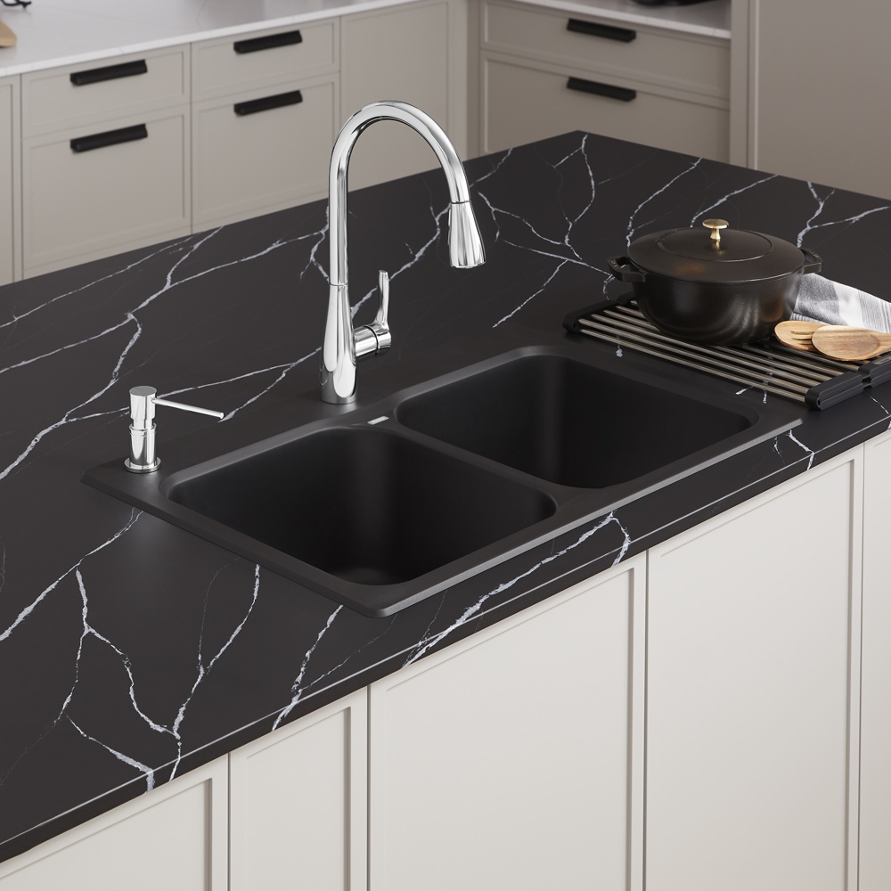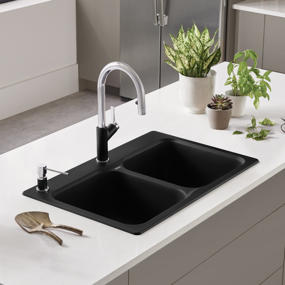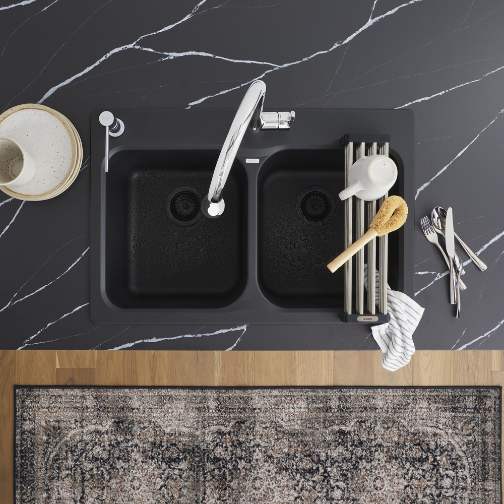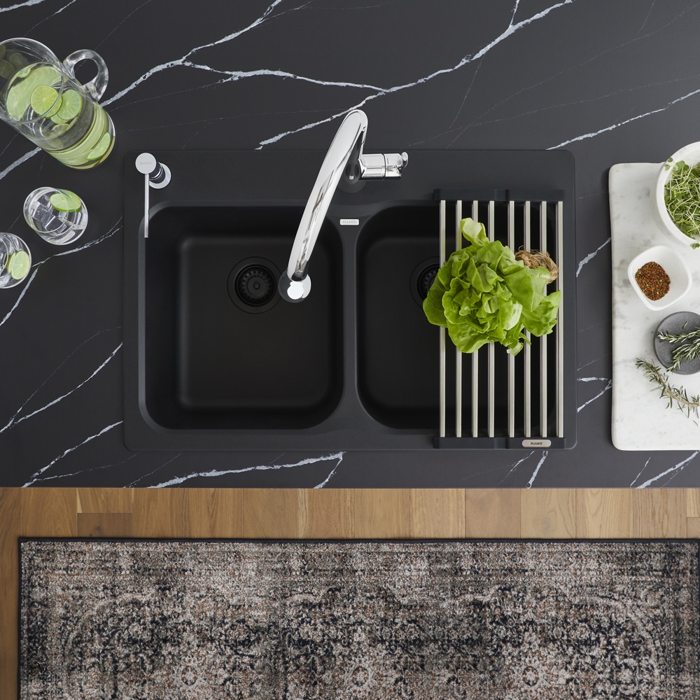 The VISION 210 kitchen sink features a dual mount, double bowl design, offering plenty of room for rinsing, washing, soaking, spraying and straining operations. VISION sinks are a smaller, more compact size perfect for retrofits with smaller base cabinets. Made of SILGRANIT®, BLANCO kitchen sinks are engineered to withstand heavy cookware and hot bakeware. Silgranit sinks are not only strong but also beautiful, available in a range of nature-inspired colours that effortlessly complement the latest kitchen trends. Combine the VISION sink with a BLANCO faucet and accessories to create a BLANCO UNIT; a seamlessly integrated kitchen solution designed to transform kitchen chores into joyful experiences. Everything you need to drink, prep and clean, all in one place.