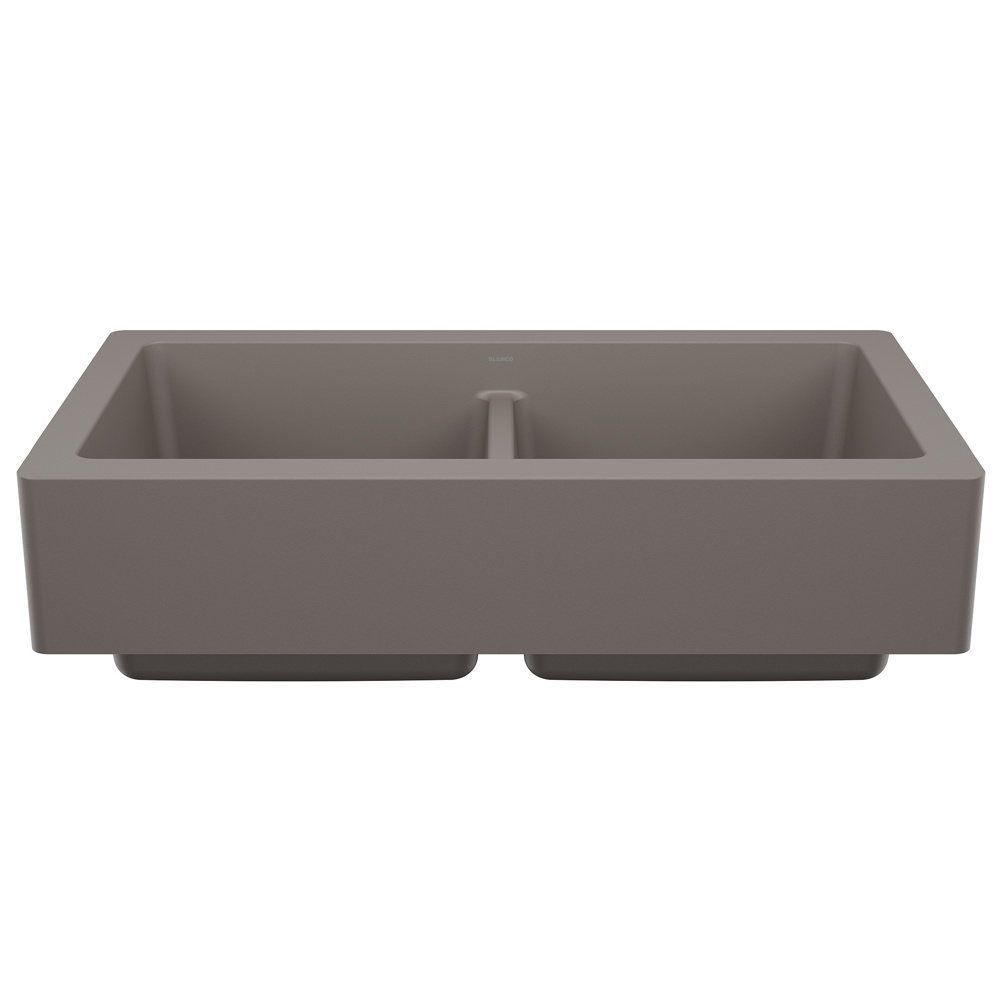 The VINTERA 33 EQUAL DOUBLE APRON kitchen sink provides a slim 6 1/2-inch apron, generous 9-inch bowl depth and two bowls ideal for multitasking. The VINTERA is a contemporary version of the farmhouse sink style with versatile installation capabilities, allowing for a unique flushmount placement. The VINTERA 33 fits into a standard base cabinet measuring 33 inches – the same width as the sink. This eliminates the need for custom cabinetry common with farmhouse sinks, making kitchen renovations easier. Made of BLANCOโs patented SILGRANITยฎ composite material, VINTERA sinks are engineered to withstand heavy cookware and hot bakeware. Strong and beautiful, Silgranit sinks are available in a range of nature-inspired colours that effortlessly complement the latest kitchen trends. Combine the VINTERA 33″ sink with a BLANCO faucet and accessories to create a BLANCO UNIT; a seamless, fully-integrated kitchen solution designed to transform kitchen chores into joyful experiences.