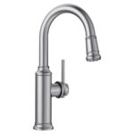 Two worlds collide with the EMPRESSA PULL-DOWN BAR FAUCET – modern features with traditional, old world detailing. Inspired by German wine country, the EMPRESSA BAR FAUCET is modeled after the shape of vintage wine presses found across Europe. Characterized by signature details such as vintage wine press handles and an innovative pull-down, dual-spray spout, the EMPRESSA is the perfect example of classic European design infused with modern features and functionality. The EMPRESSA can be easily installed in kitchen islands, wet/dry bars, or smaller kitchens with less clearance space.