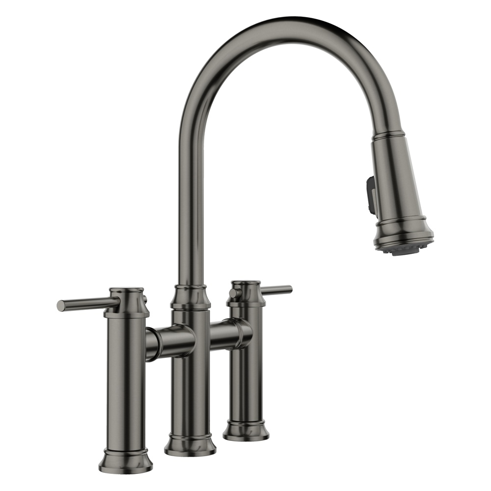 Two worlds collide with the EMPRESSA PULL-DOWN BRIDGE KITCHEN FAUCET – modern features with traditional, old world detailing. Inspired by German wine country, the EMPRESSA BRIDGE FAUCET is modeled after the shape of vintage wine presses found across Europe. Characterized by signature details such as vintage wine press handles and an innovative pull-down, dual-spray spout, the EMPRESSA is the perfect example of classic European design infused with modern features and functionality.