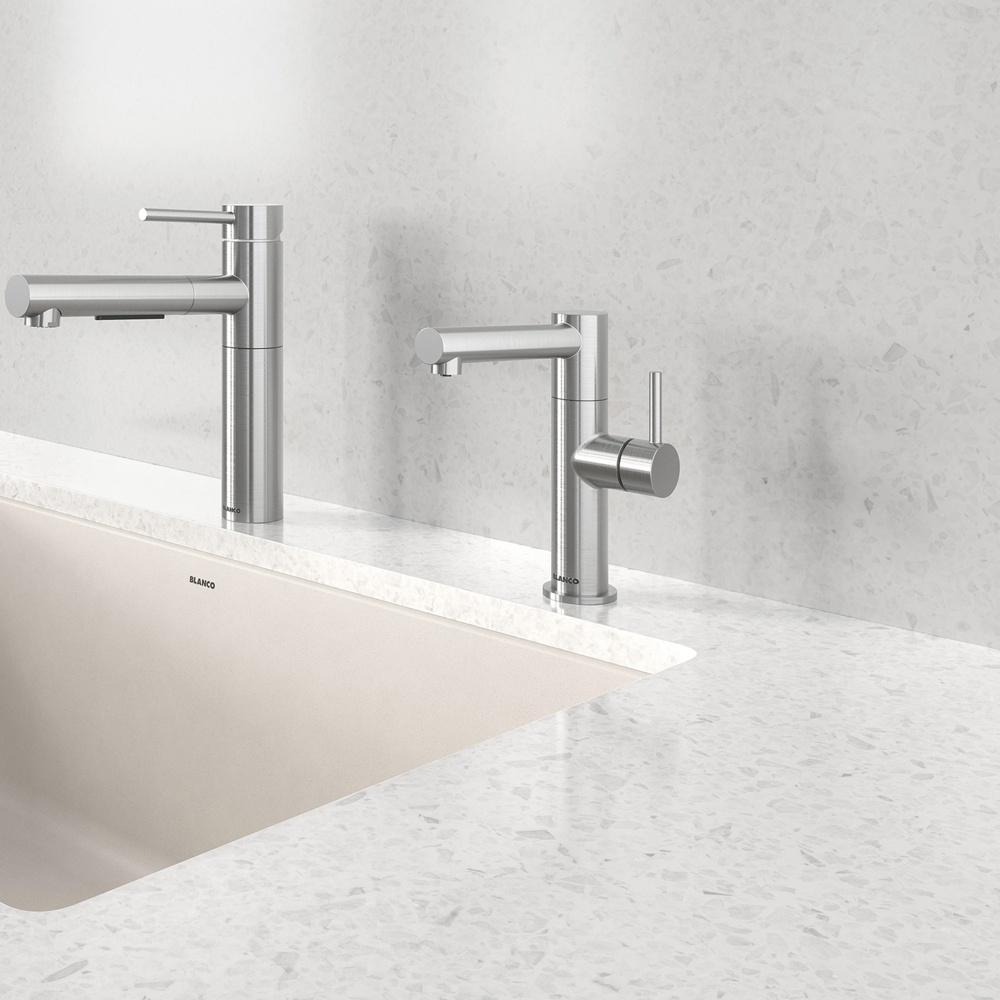 Elevate your beverage service with the ALTA II Beverage Faucet. Providing water on demand right at the kitchen sink station, the long spout of the cold-water faucet makes filling tall glasses and pitchers effortless. Connect to a BLANCO filter starter set to ensure hassle-free access to filtered water. Easily pair the ALTA II Beverage faucet with an ALTA II kitchen faucet for a cohesive, sleek look in the same finish. Combine the faucets with a BLANCO sink, filtration and organization for an optimized BLANCO UNIT.