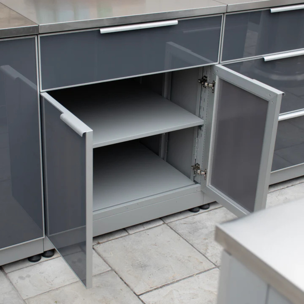 • Doors open 90 degrees and stay in place while open. Doors include soft close
