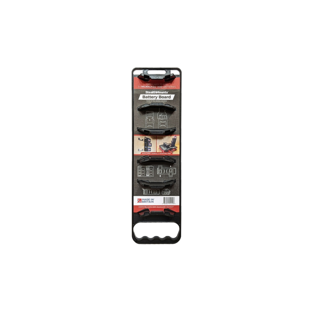 StealthMounts Milwaukee M18 Battery Boards can securely store up to three batteries. Our Mounting Feet are molded into the rear of the Battery Board making them compatible with our Mounting Cleats and Milwaukee Packout. Perfect for transporting your batteries to and from the jobsite. Batteries can be mounted from either direction and won’t fall out when being carried around. The board has two blind holes in the center opening up more mounting and storage options. Attach a Bench Belt to the rear of your Battery Board and you have instant storage and transportation for your impact driver or tape measure. The possibilities are endless.