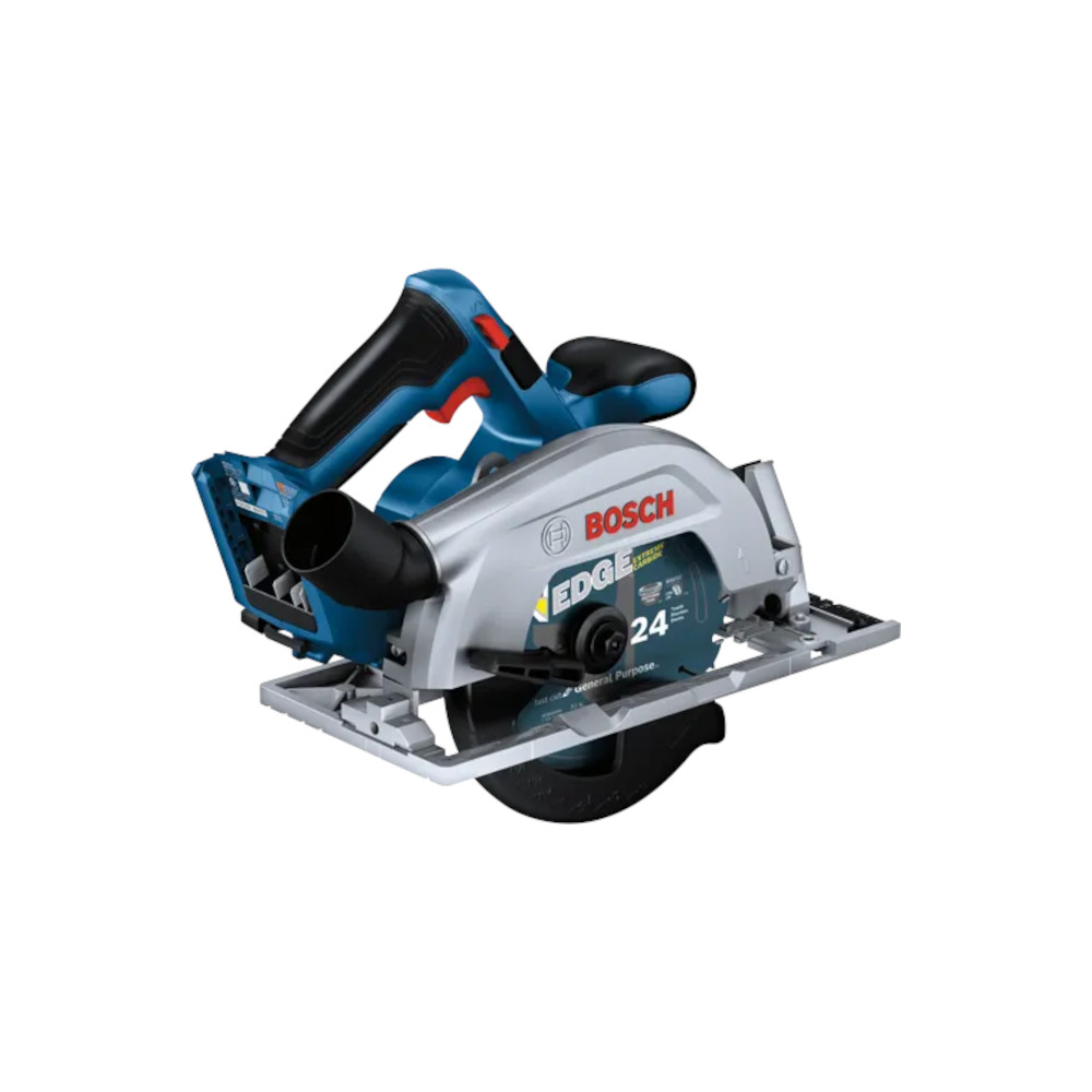 This circular saw has a 2-1/4 In. cut capacity, cutting through 2X (“two by”) material across the entire bevel range. The Bosch GKS18V-22 18V Blade-Right 6-1/2 In. Circular Saw has a brushless motor, which delivers efficient runtime and 5,000 rpm with professional dependability. This compact saw weighs only 6.1 Lbs. (tool only, not including battery). The auxiliary handle improves stability and ergonomic handling in either hand. The saw’s convenient depth gauges are visible from either side of the saw and it has a 0-50 degree bevel range, with detents at 0, 45 and 22-1/2 degrees. It features two convenient depth gauges, one on the lower guard and one by the housing so depth is visible on either side of the saw. It has an electronic convenience brake for less downtime between cuts. The 360 degree pivoting dust port directs dust away from the body when the saw is held in either hand. This saw also features a cut-line LED to illuminate workpiece cutting area for improved cut-line visibility. It includes an on-board blade-change wrench and spindle lock for easy blade changes.