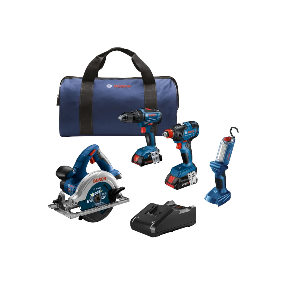 The Bosch GXL18V-497B23 Four-Tool Kit is a four-in-one way to unleash cordless performance. This kit provides driving, drilling and cutting – all on Bosch’s 18V tool platform. Included is the GDX18V-1800 two-in-one cordless impact driver/wrench for use with bits and sockets. It does two jobs with one tool and goes from impact wrench to impact driver fast. The GSB18V-490 1/2 In. Hammer Drill/Driver delivers 490 In.-Lbs. of torque and a no-load bpm of 0-22,000, to tackle demanding materials and applications anywhere on a worksite. This powerful tool features 20+1 clutch settings, for reduced overtightening. The Bosch CCS180B 18V 6-1/2 In. Circular Saw easily cuts through 2x (“two by”) material across entire bevel range of 50 degrees. Its ergonomic main handle that is angled for ease in pushing the saw forward. The GLI18V-300 is a bright light with 300 minutes of runtime per amp hour. The kit comes with a CORE18V® 4 Ah Advanced Power Battery, an 18V 2 Ah Standard Power battery and an 18V charger.