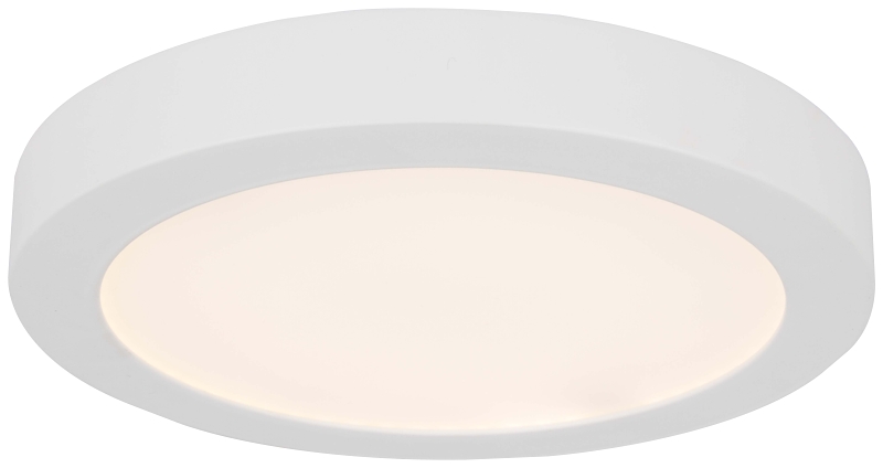 LED flush mount ceiling fixture has a white finish, acrylic shade, 50 lumens, 3000K warm white, 120V 12W. Size: 7-1/2 in W x 1 in H, dimmable. LEDs included; no bulbs to replace. 5-year Limited Warranty, ETL Listed / Energy stars.