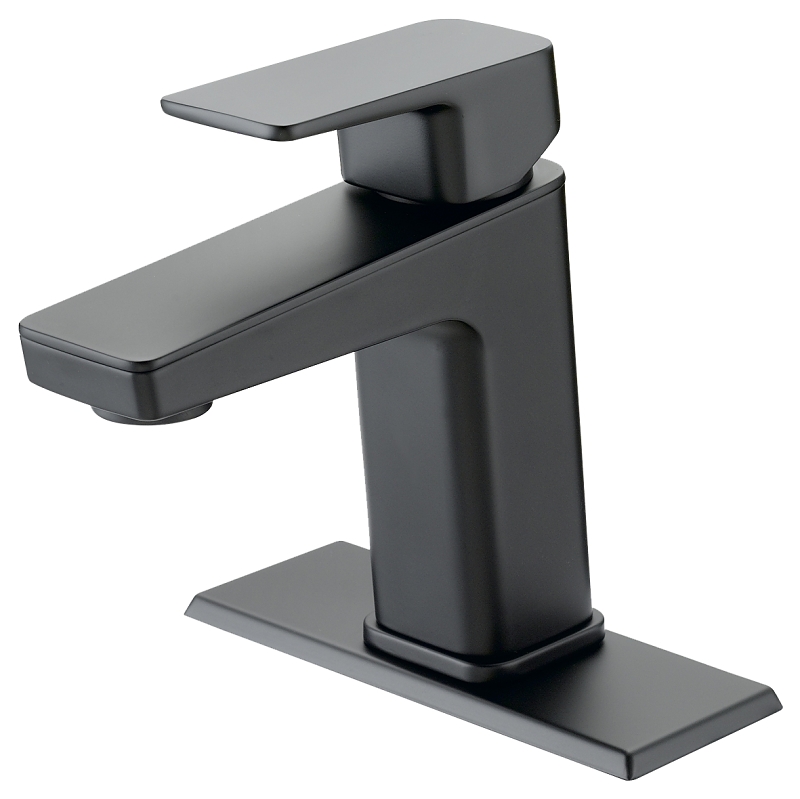 Bathroom faucet has a plastic push on pop-up, lever handle, 1-faucet handle, matte black finish. 1 or 3 faucet hole installation.