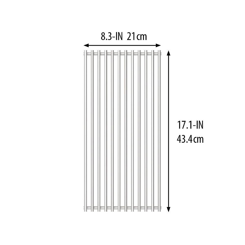 Outfit your grill with the heavy-duty stainless steel rod cooking grids from Broil King. 9mm thick in diameter, these rods are engineered for superior heat retention making searing an easy task. Additionally, solid stainless steel is extremely rust resistant reducing the amount of effort required for maintenance. Fits Sovereign, Regal (prior 2007), Broil-Mate Connoisseur 4/5/6, Evolution 40, and Texan, and Sterling Evolution series grills. 17.1 in. x 8.3 in.. Includes 1-piece.