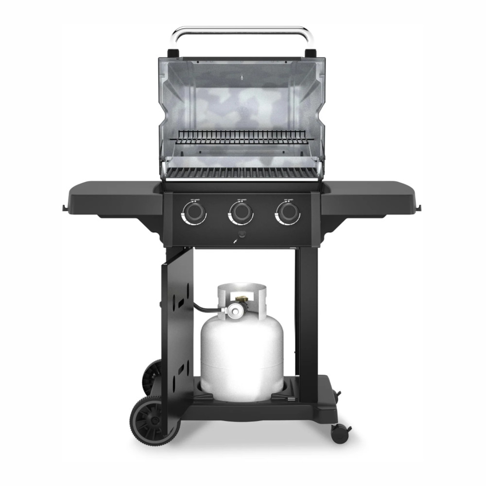 The Royal™ 320 delivers dependable grilling performance in a practical size with a 350 sq. in. primary cooking surface. It’s powered by three stainless steel Dual-Tube™ burners and a stainless steel Flav-R-Wave™ cooking system for even heat and great flavor, plus electronic ignition for quick, reliable starts. Reversible heavy-duty cast iron cooking grids add versatility, while painted steel drop-down side shelves and an enclosed cabinet base provide convenient prep space and storage.