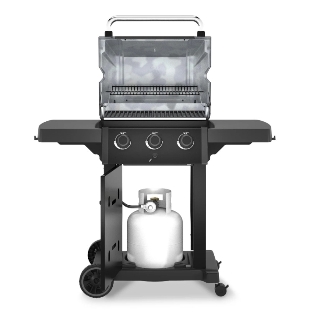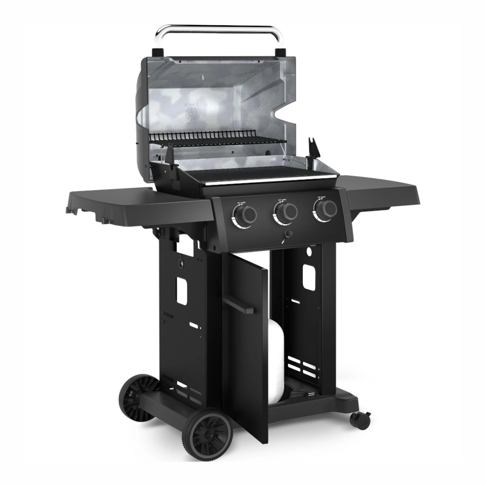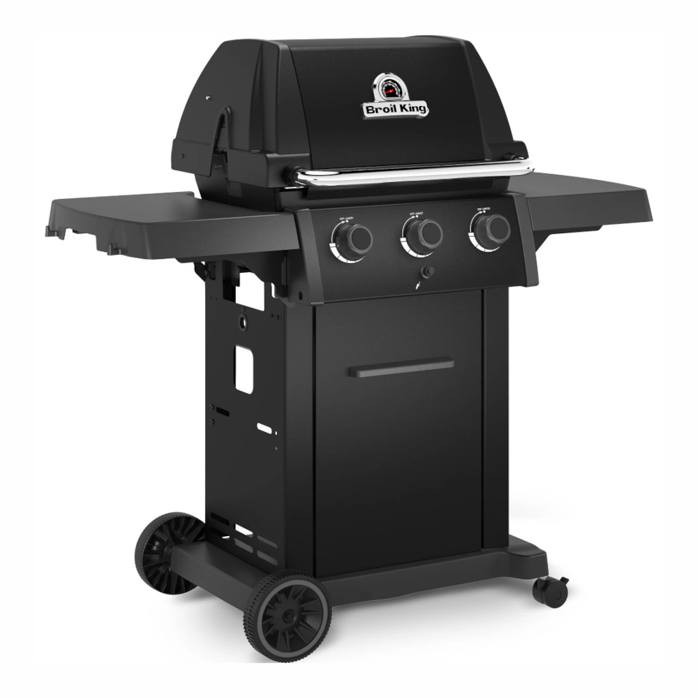 The Royal™ 320 packs reliable performance into a practical size with a 350 sq. in. primary cooking surface. It features three stainless steel Dual-Tube™ burners, a stainless steel Flav-R-Wave™ cooking system for even heat and great flavor, and electronic ignition for easy starts. Reversible heavy-duty cast iron cooking grids add versatility, while painted steel drop-down side shelves and an enclosed cabinet base provide convenient prep space and storage.