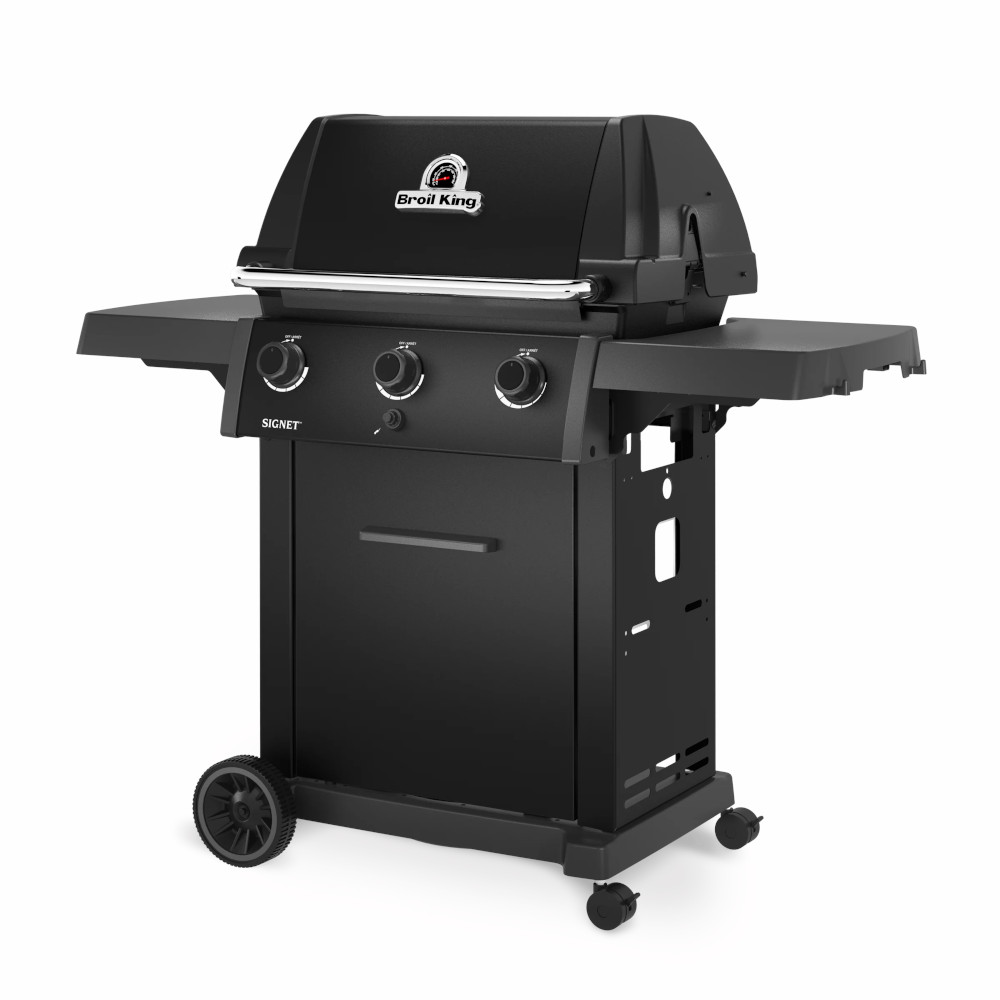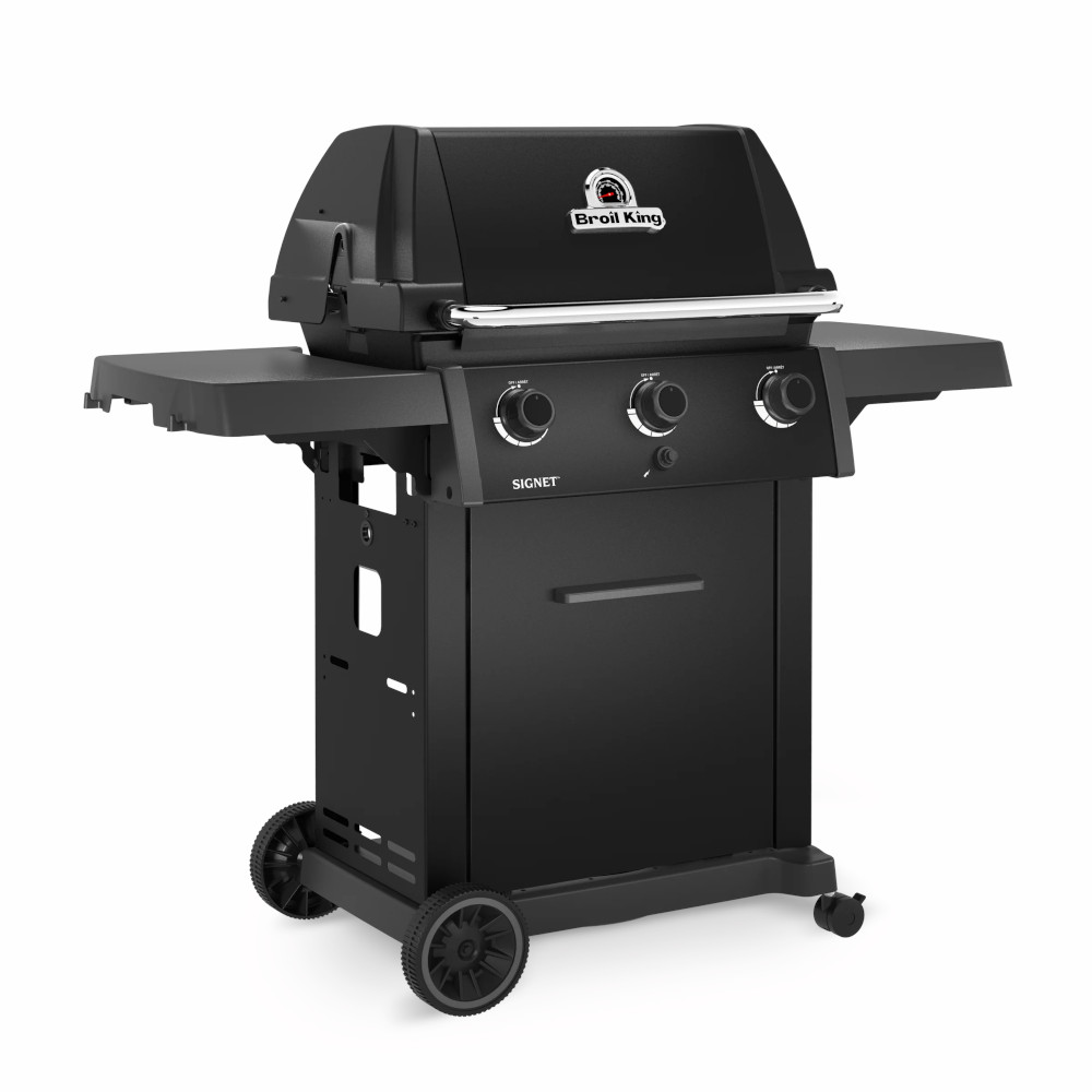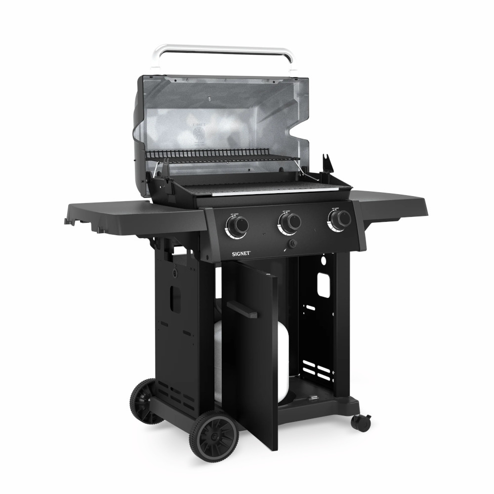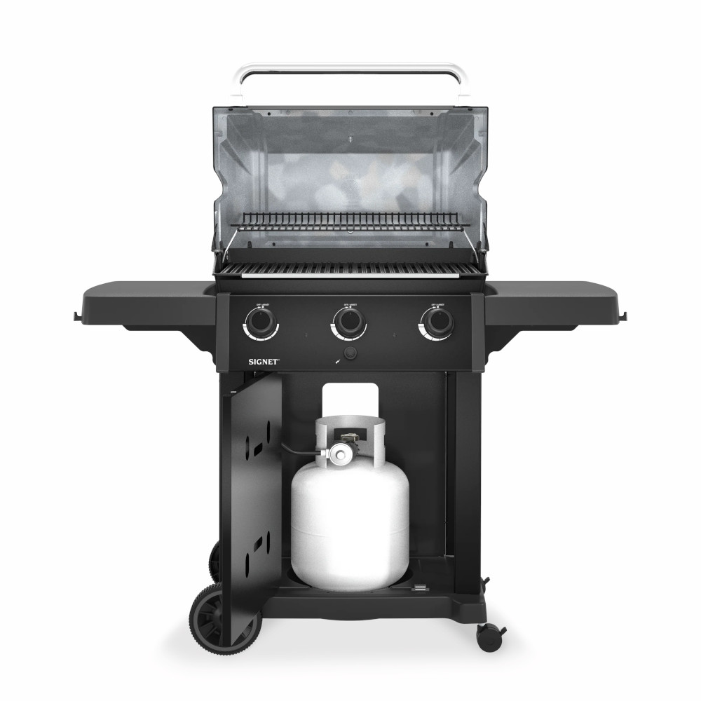 The Signet™ 320 Shadow delivers serious grilling space and durable performance with 635 sq. in. of total cooking area, including a porcelain-coated warming rack. It features heavy-duty cast iron cooking grids, a stainless steel Flav-R-Wave™ cooking system, and three stainless steel Dual-Tube™ burners for consistent heat. Finished with stainless steel drop-down side shelves and an enclosed cabinet base for clean storage and a streamlined look.