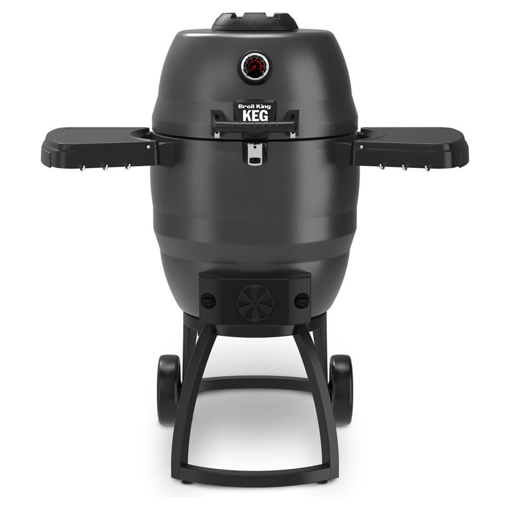 The Broil King Keg 5000 features 480 sq. in. total cooking space, including a chrome coated secondary rack, a heavy-duty cast iron cooking grid, removable ash tray, resin side shelves, a durable steel base and metallic charcoal paint finish.