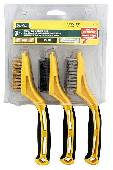 This mini wire brush set contains three wire brushes with a handle length of 4 1/2 inches and a 5/8-inch trim length. Each brush has a short overmold handle and a built-in plastic scraper. The bristle material of the three brushes is nylon, brass, and stainless steel. These brushes are designed to scrape and clean peeling paint and other unwanted debris.
