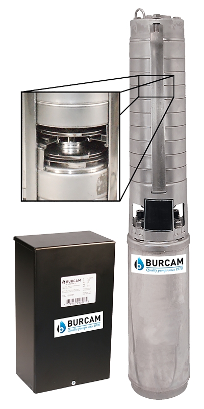 Burcam Submersible Well Pump, 4 x 1-1/4 in Connection, NPT Connection, 230 VAC, Frequency Rating: 60 Hz, Number of Phases: 3, 0.75 hp, 10 gpm, 20 to 50 psi, Maximum Head: 275 ft, Number of Stages: 12, Stainless Steel, Includes: Control Box