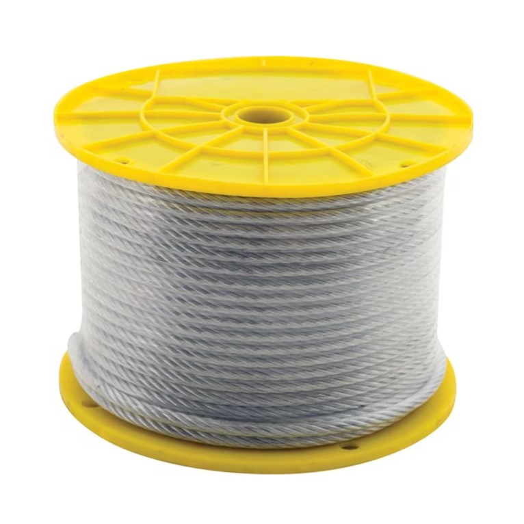 7×7 cable consists of 7 individual wires that are laid in a spiral around a center or king wire to form a strand. These strands are then twisted together to form a cable. Each wire is hot-dipped in galvanized steel and the finished cable is covered in a PVC coating for even better corrosion resistance. The cable measures 1/4 in with the PVC coating and 3/16 in when stripped. Typical applications include use as garage door cables, for tie-downs, in dog runs, for hanging signs, and as guy wires for antennas and flagpoles. Do not use for overhead lifting. Never exceed the Safe Working Load of 740 lb. This cable is sold by the foot, in-store only. An associate in any Home Depot Store can assist with cutting this rope to your desired length.